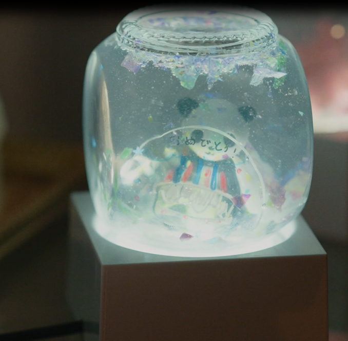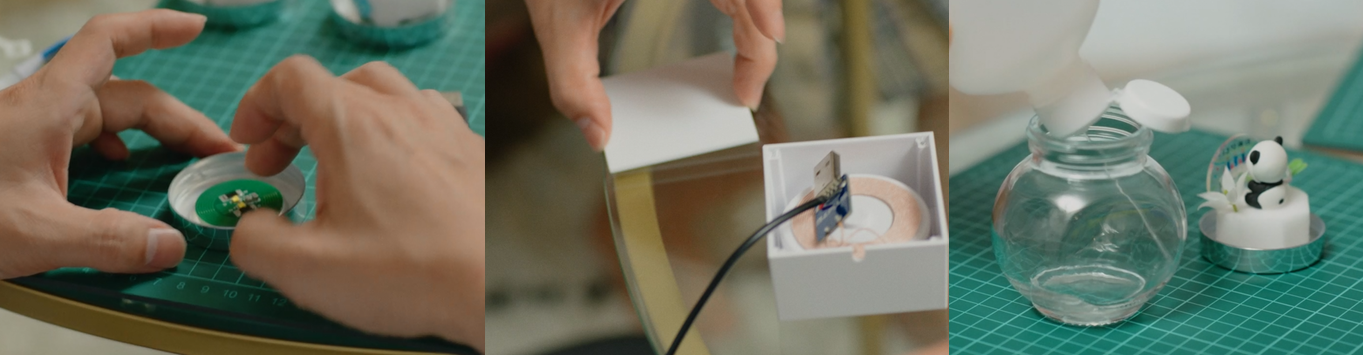台座側の送電コイルから、スノードームの蓋に内蔵しておいた受電コイルへワイヤレス給電することで、スノードームの中が光ります。キャンドルのように幻想的な光が誕生日ケーキを彩ります。
