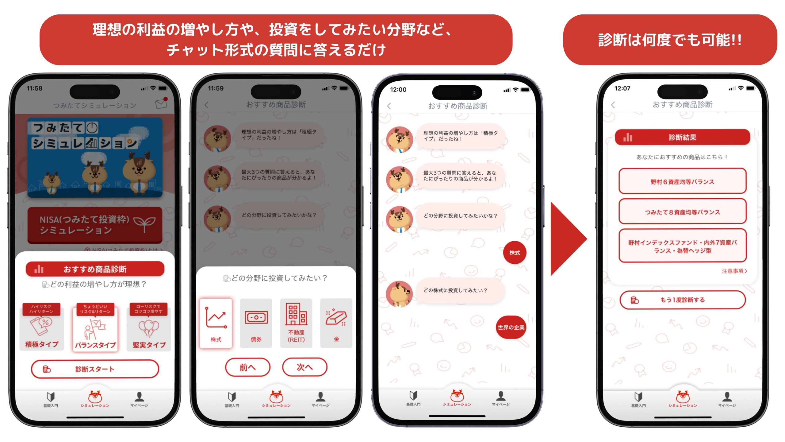 「NISA(つみたて投資枠)」や「iDeCo」で毎月いくら、何年積み立てるといくら貯まるのか、自身の状況に合わせてシミュレーションができる他、チャット形式の簡単な質問に答えておすすめ投資商品の診断や、イラスト付きのわかりやすい解説で、楽しく投資の基礎知識を学ぶことができます。