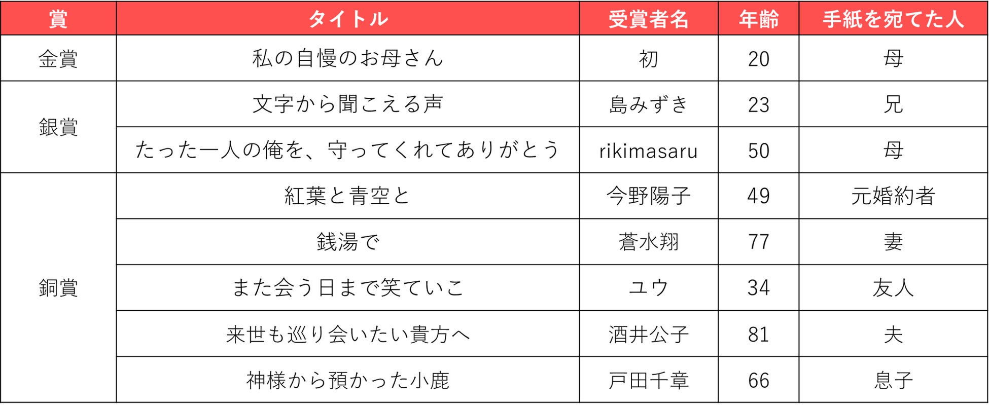 毎年、審査に参加させてもらっていますが、毎年、思います。「このコンテストで大事なのは、文章の上手い下手じゃない」と。今回、ご応募いただいた方々のお手紙もそれぞれに“味”のようなものがあって、それぞれに実体験をもとにした想いの深さを感じ取ることができました。