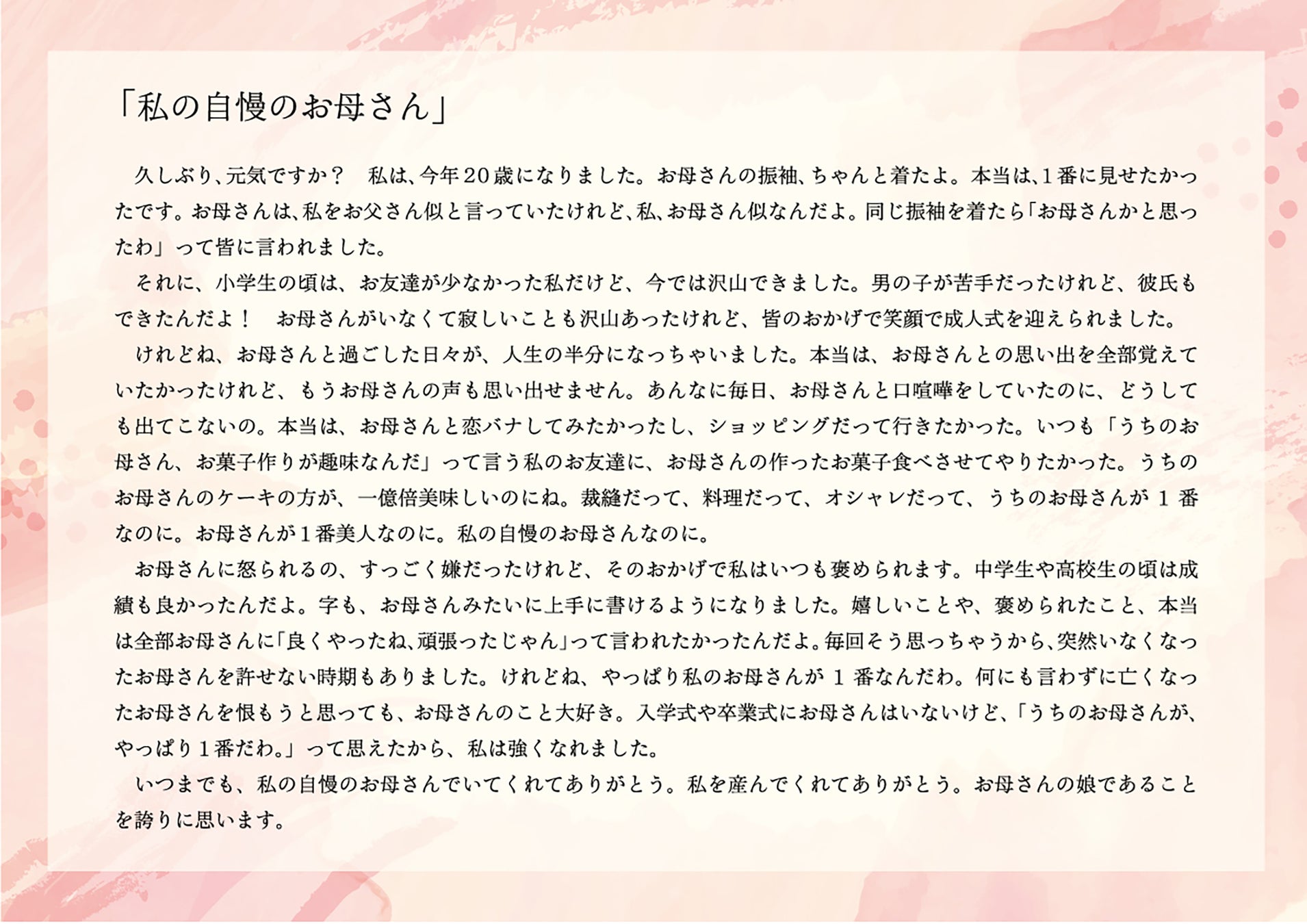 金賞「私の自慢のお母さん」初さん(20歳)母に宛てた手紙
