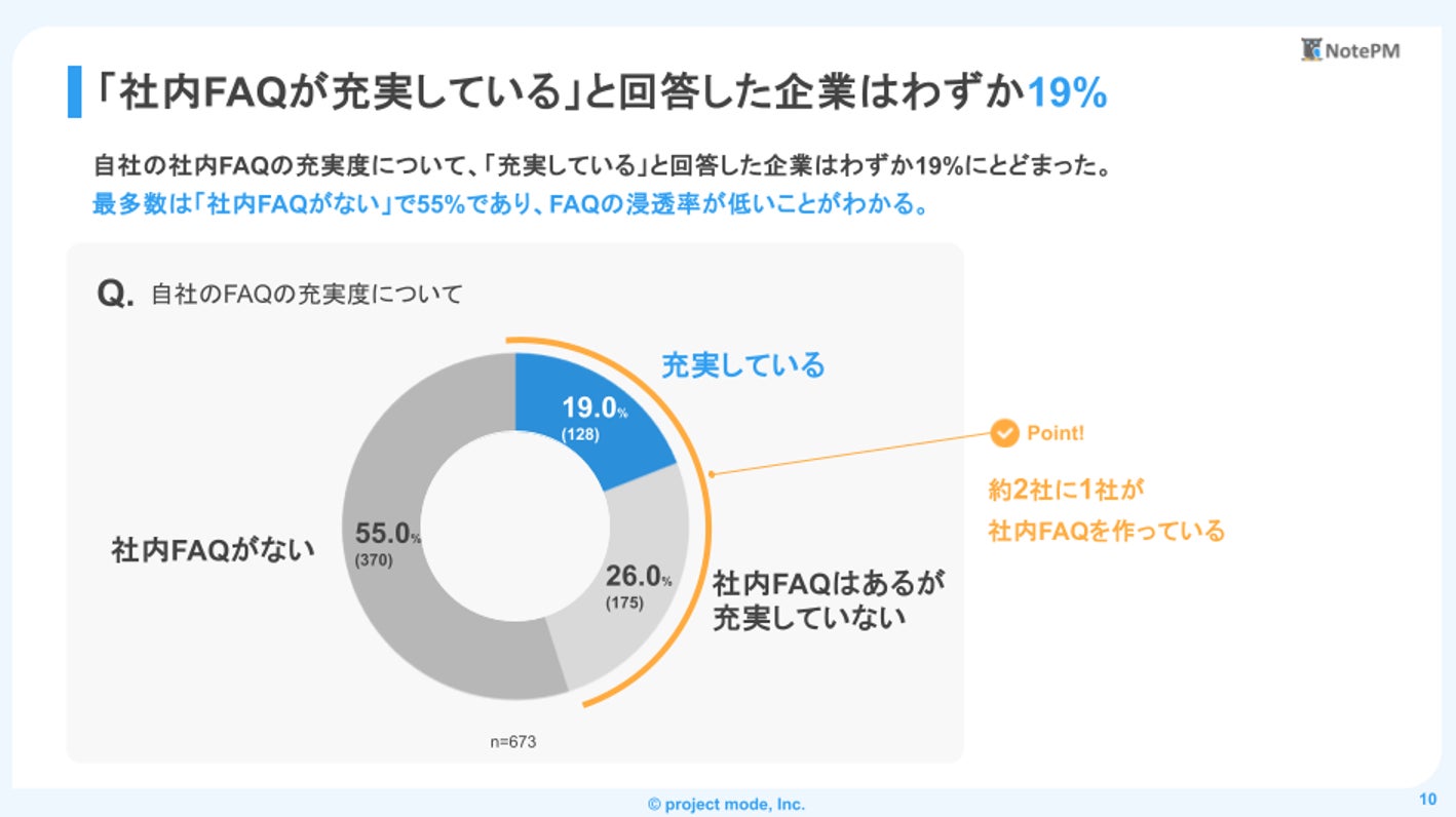 社内FAQの充実度について調査したところ、2社に1社は社内FAQを作っていますが、その社内FAQが「充実している」と回答した企業はわずか19%でした。