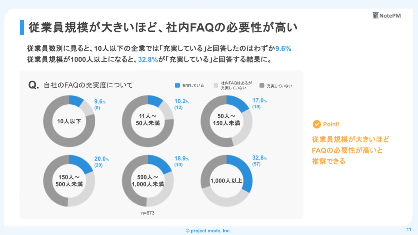 ナレッジマネジメント専門のITツール「NotePM」を提供する株式会社プロジェクト・モードは、(本社:神奈川県川崎市、代表取締役社長: 小澤 卓馬)は、国内企業に勤める経営者・会社員673名を対象に社内FAQの活用に関するアンケート調査を実施。実態をまとめたレポートを公開しました。
