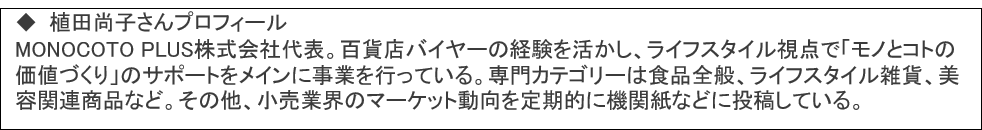 | ◆ 植田尚子さんプロフィール MONOCOTO PLUS株式会社代表。百貨店バイヤーの経験を活かし、ライフスタイル視点で「モノとコトの価値づくり」のサポートをメインに事業を行っている。専門カテゴリーは食品全般、ライフスタイル雑貨、美容関連商品など。その他、小売業界のマーケット動向を定期的に機関紙などに投稿している。 |