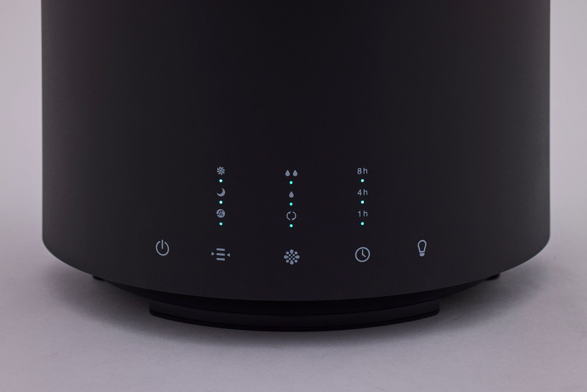 タンク下部LEDは、お好みの色を選べるように改良。1/fゆらぎ点灯機能も搭載し、空間を彩ったり、空間に馴染ませたりと暮らしのさまざまなシーンや気分に合わせて調光・調色ができます。本体カラーは都会的で洗練された印象のオールブラックに仕上げ、さらなる上質感を追求。さらに、コードの差し込み口の位置を本体背面に変更することで、より扱いやすくなりました。