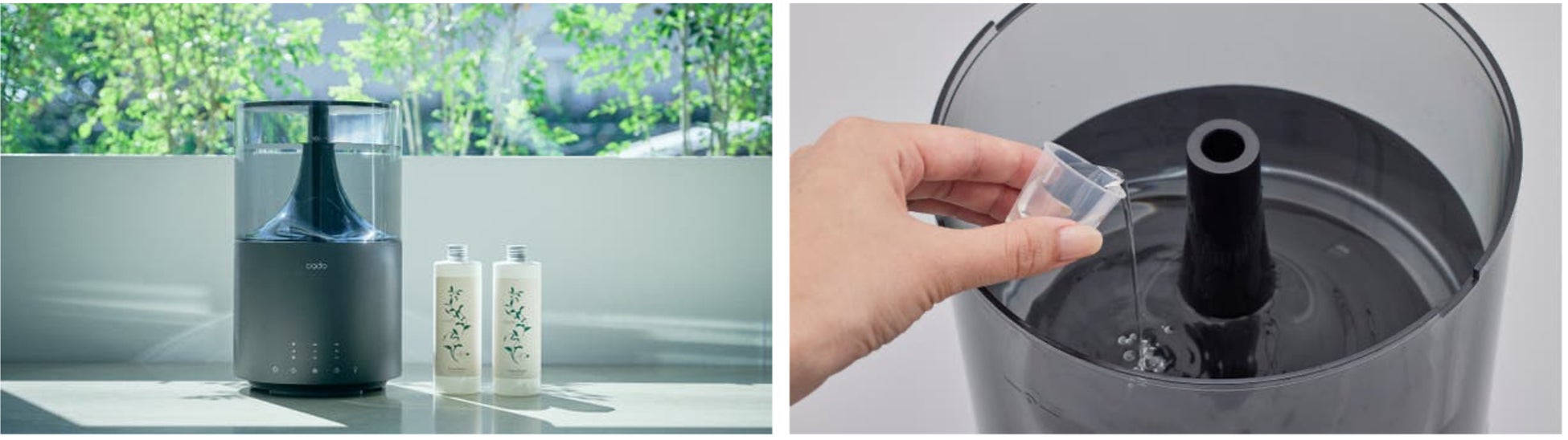 水を張ったタンクに別売のオリジナルフレグランスウォーター「フォレストウォーター フレッシュブランチ/テンダーリーフ」や「シトラスウォーター TAN/YOI」を適量※加えることで、ミストとともに穏やかな香りがお部屋に広がります。仕事の合間にリフレッシュしたいときや就寝前にリラックスしたいとき、心地よい空間づくりをサポートします。