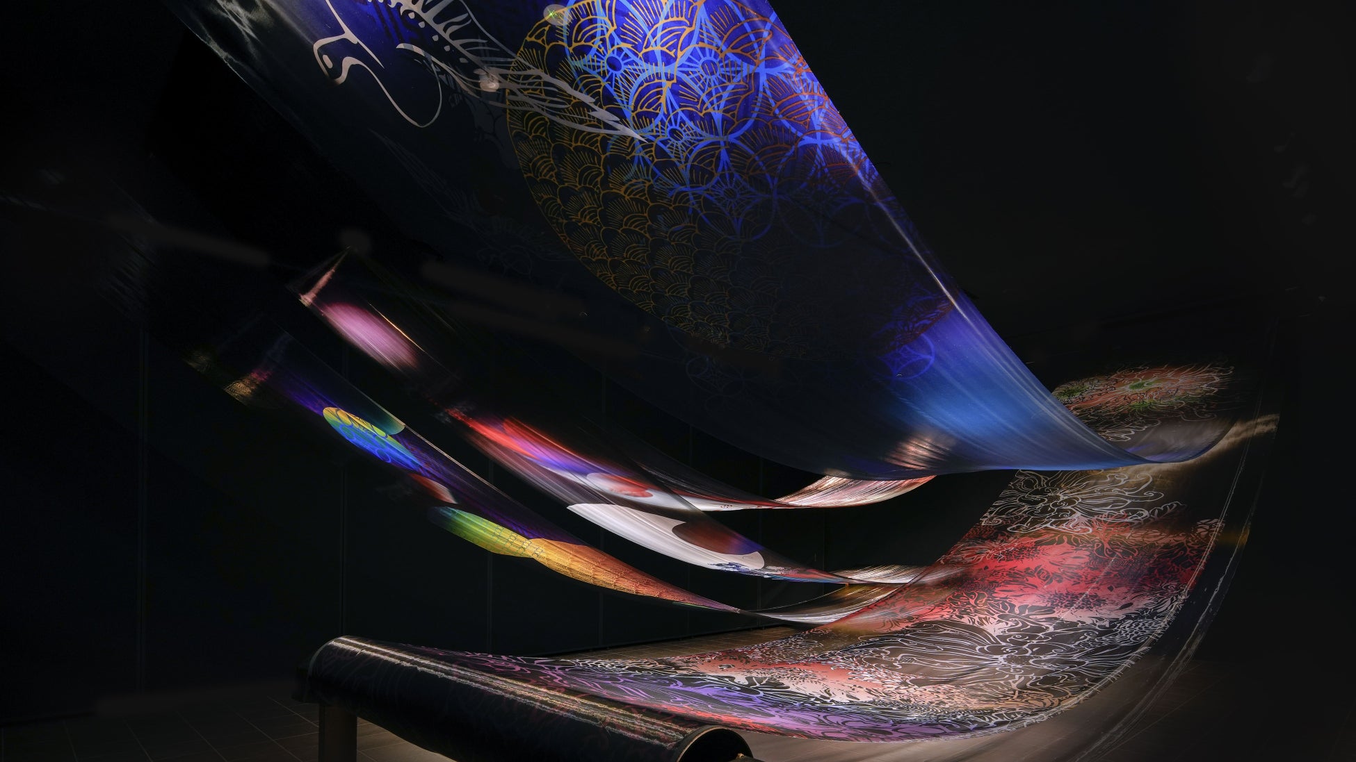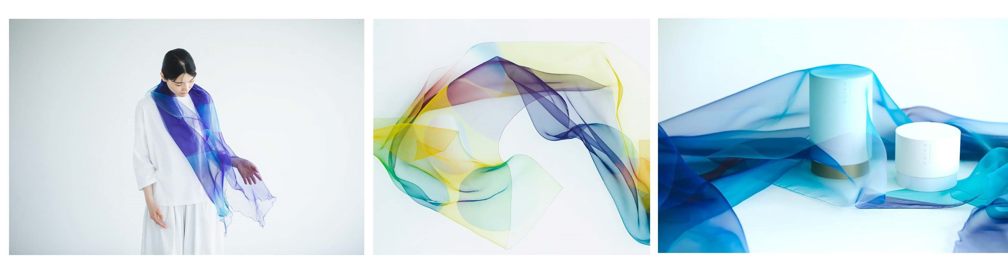 今回の展覧会は、「九谷に包まれる」展と題し、人よりもはるかに大きいテキスタイルを使用して“九谷焼柄の布の空間”を演出します。使用するテキスタイルは、世界のラグジュアリーブランドからも高く評価されている、当社の超極薄素材「天女の羽衣」です。丸や直線などグラフィカルなモチーフから九谷焼の絵模様や九谷五彩を表現します。極薄素材ゆえの繊細な動きと重なりが生み出す多様な色彩とフォルムをお楽しみください。