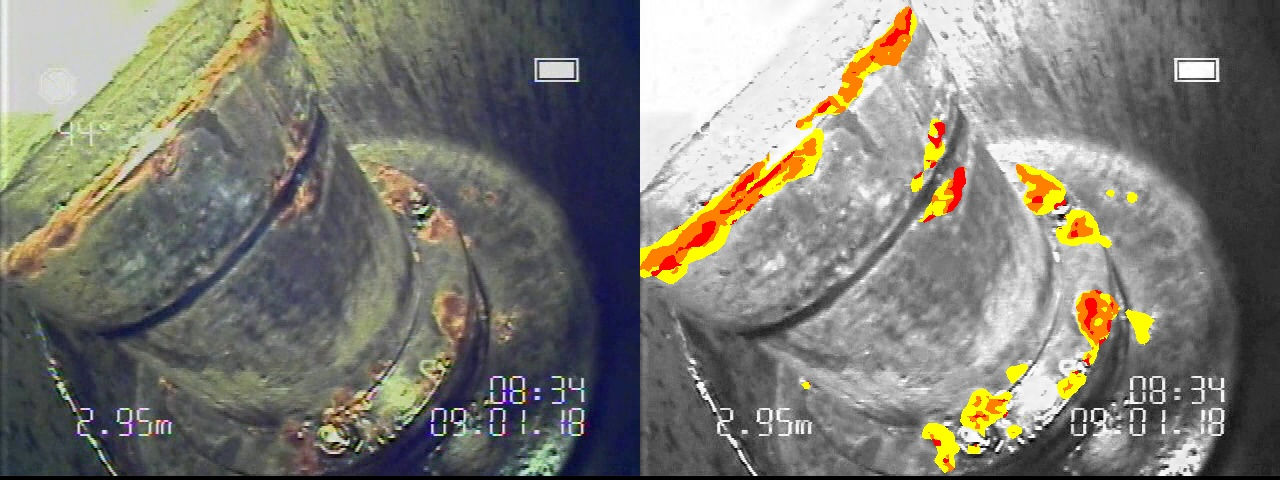 内視鏡カメラで撮影された動画データをクラウド環境上のAIに転送し解析すると、元の動画上のサビがある箇所に対して劣化度ごとに色付けされたデータを確認することができます。