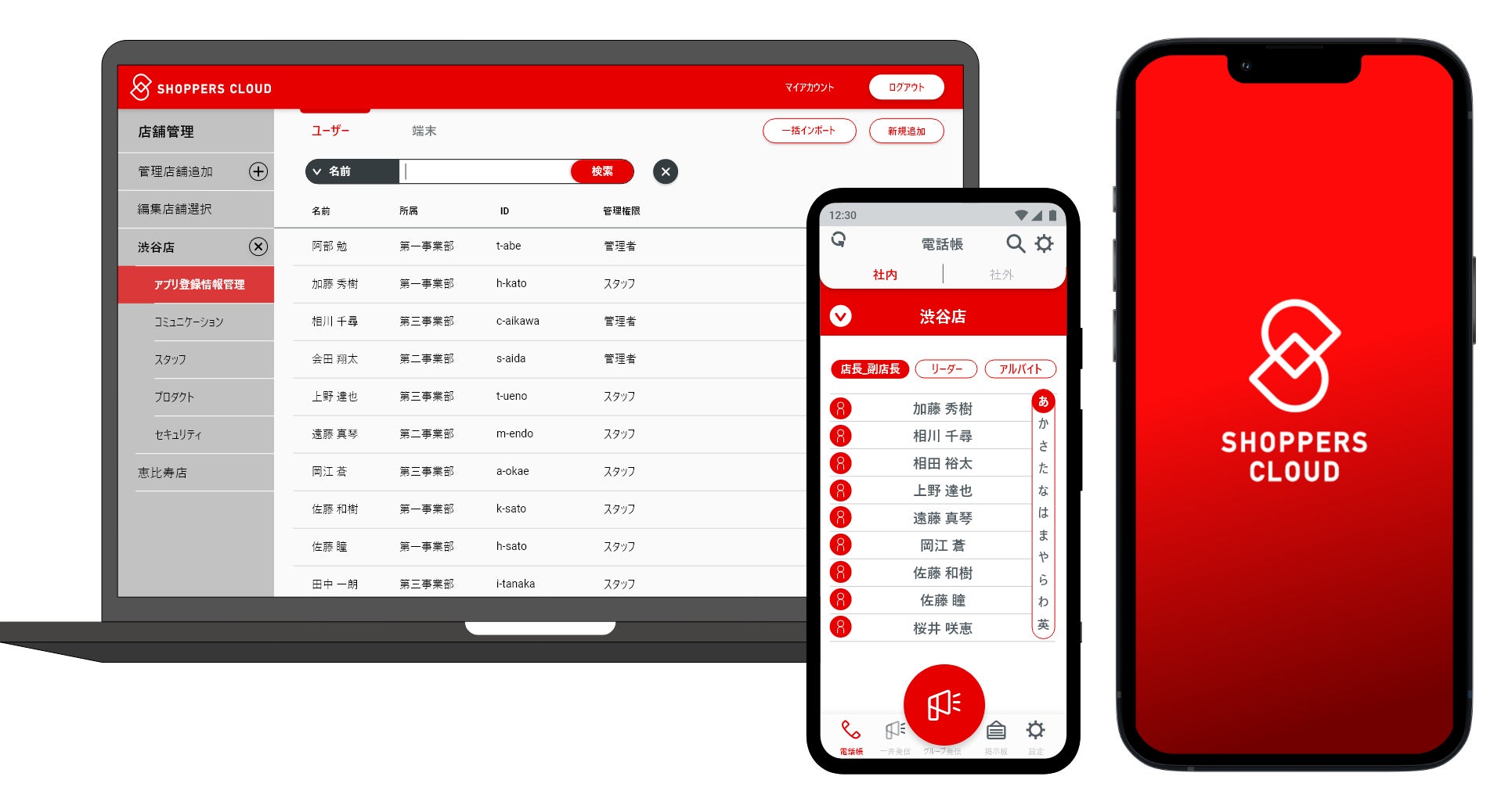 店舗業務支援サービス「SHOPPERS CLOUD」は、さまざまな店舗業務のDXを支えるクラウドサービスです。店舗業務に必要なさまざまな機能をスマートフォン1台に集約します。店舗のコミュニケーションにおいて円滑な情報共有を行なうためのコミュニケーション機能、店舗の発注業務・検品業務・在庫検索業務を担う商品管理機能、店舗と本部間等の指示業務・タスク管理業務を担うスタッフ管理機能、店内機器と連携し店舗の安心・安全を守るセキュリティー機能を有しています。