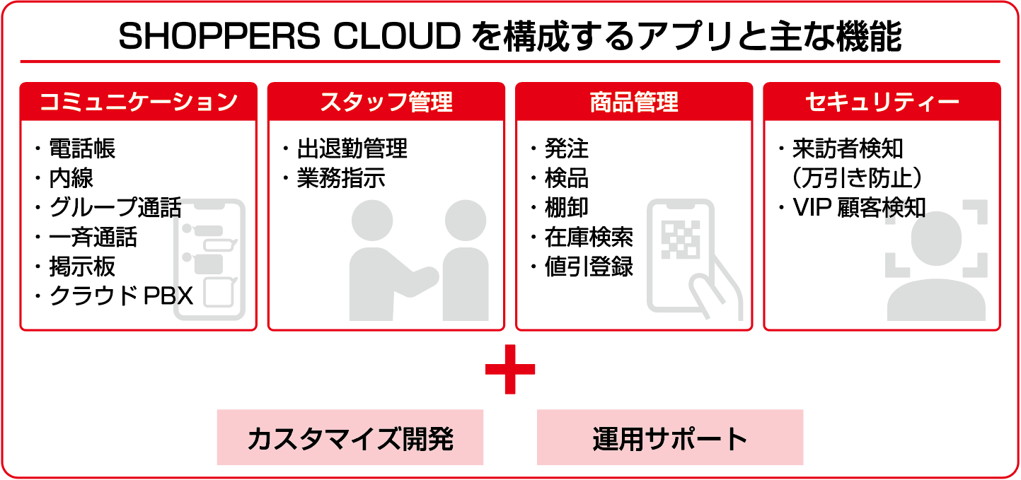 このような背景から、お客さまの業務・運用ニーズに応じた機能をスマートフォン(※1)1台に集約することで、業務効率化と業務品質向上を実現する店舗業務支援サービス「SHOPPERS CLOUD」を開発しました。