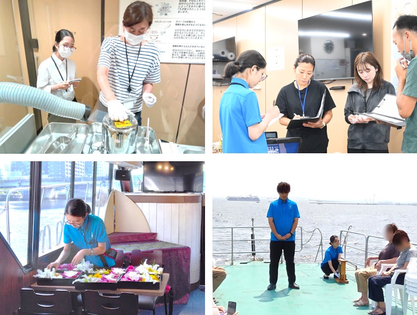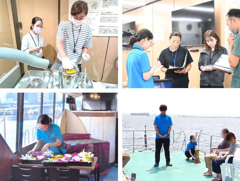 早速、東京(勝どき)発の散骨クルーズへの乗船を初体験。出発前のブリーフィングでは、船長や先輩コーディネーター達と共に天候や海況の様子、お客様の情報などを漏れなく確認します。船内に移動した後は、掃除とテーブルをセッティングしお客様をお迎えする準備を整えます。出航の時間が刻々と迫る中、海面を彩る花々を丁寧に並べて海洋散骨式の準備を仕上げていきます。