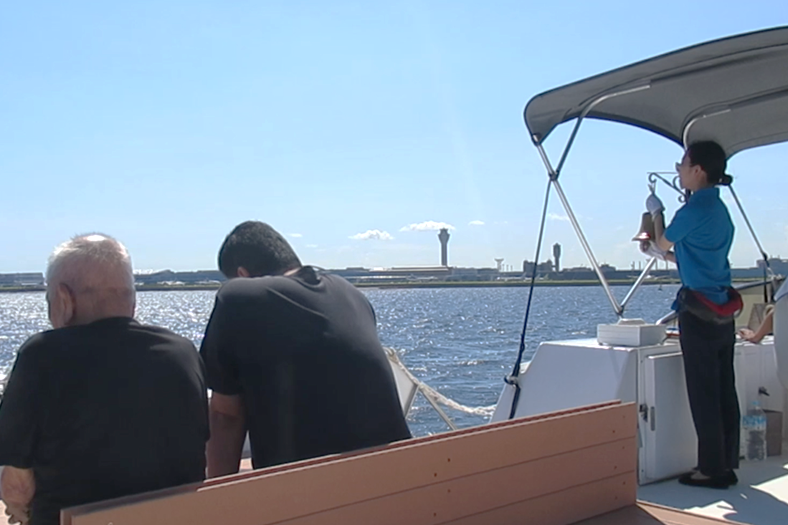 沖合のポイントに到着したら、海洋散骨式の開式。進行は台本の台詞をなぞりながらも、ひと言ひと言に目の前のお客様への想いを乗せて届けます。後部デッキに移動して、おひとりずつ散骨をご案内。散骨を終えた方から2階へ移動していただき、皆さんが揃ったところで最後のセレモニーの進行が始まります。船に備え付けられた鐘を手に取り、ゆっくりと10回、ペースを揃えて鐘の音を響かせます。ご家族全員が鐘の音に耳を傾けながら故人様へ黙祷を捧げ、緊張の高まりも最高潮。10回目の鐘を鳴らした後は散骨した場所を船で旋回し、一礼してセレモニーを無事に締めくくりました。散骨を終えて清々しいお客様の表情に、ほっと一安心。お客様にとって一度きりとなるセレモニーをしっかりお届けできました。