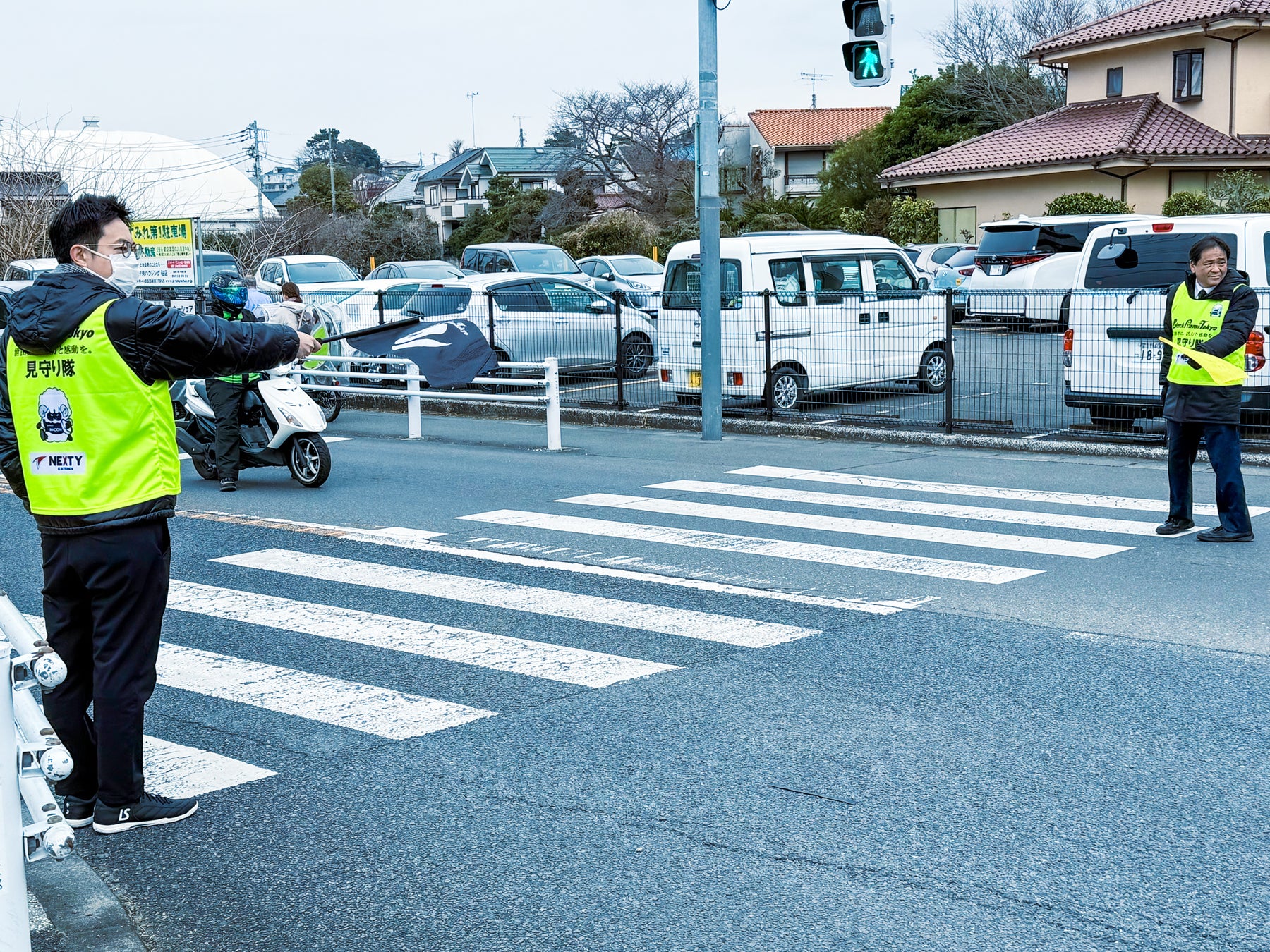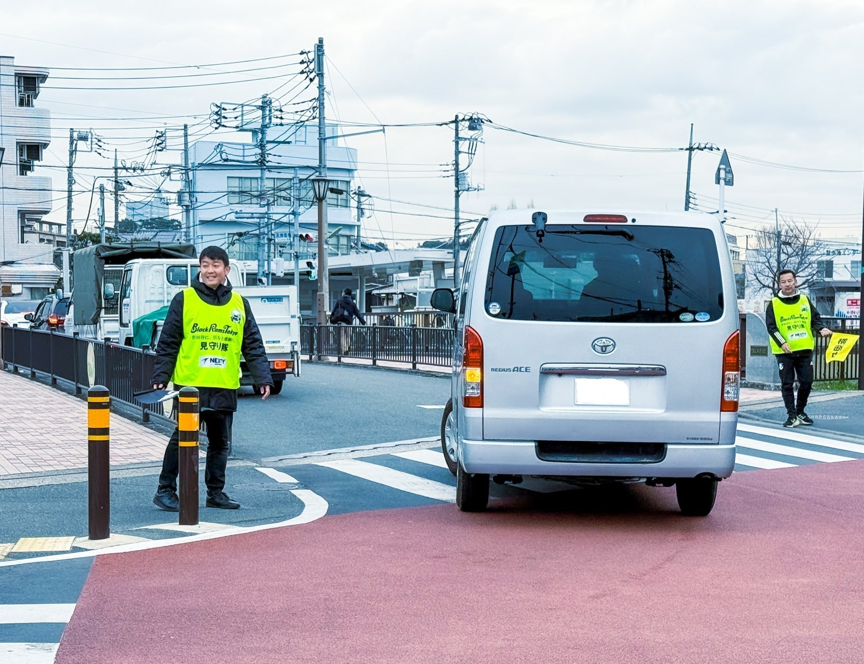「見守り隊」とは、ブラックラムズ東京が世田谷区のグラウンド近隣において、毎月第 2・4 火曜日の朝の通学・通勤時に横断歩道などで子供たちや住民の方々の安全を見守り、終了後にゴミ拾いを行う活動です。この活動は2020年から続いており、地域の交通安全の促進と環境美化に寄与しています。