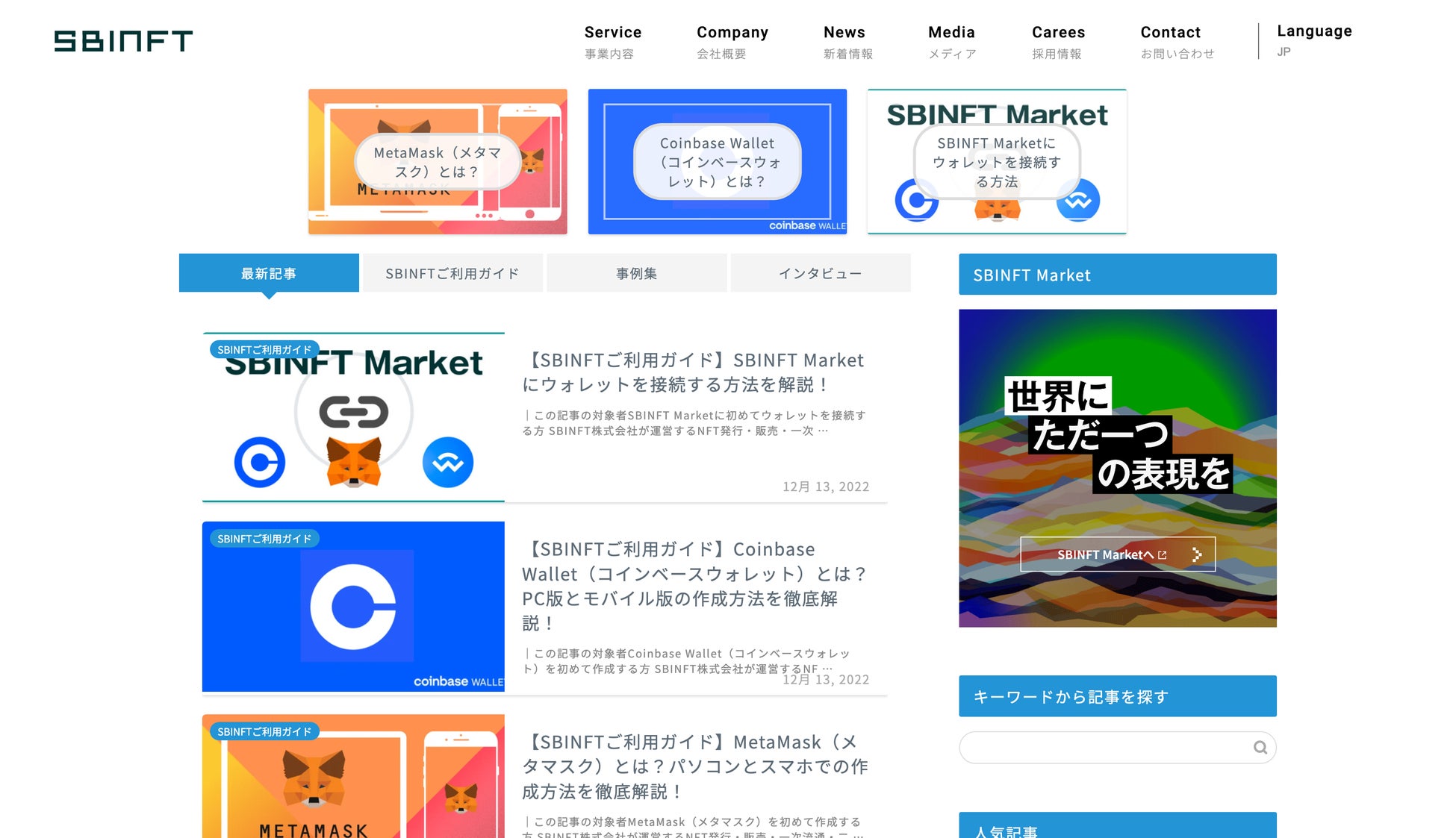 初心者の方でもNFTに関する知識を網羅できるような暗号資産(仮想通貨)に関する専門用語の解説記事のほか、ウォレットの作り方や、SBINFT Marketにウォレットを接続する方法などのハウツー記事をご用意しています。今後は初心者の方だけでなく、クリエイターやエンジニアの方も対象に、NFTに関するニュースやまとめ記事のほか、SBINFT Marketの登録アーティストに関連する新着情報も発信していきます。