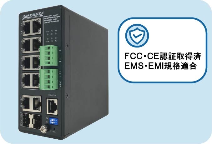 弊社初の産業用PoEスイッチで、耐久力の高いメタル筐体。高温・低温稼働や湿度に強く高耐久で、EMS認証・EMI認証やFCC・CE認証を取得している安全性・信頼性に優れた製品となっております。