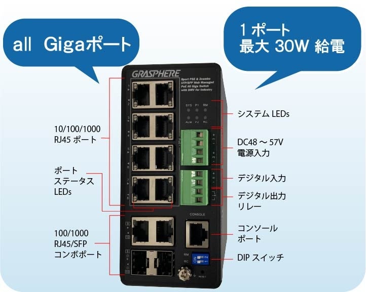 ・all-Gigaポート、RJ45/FSPコンボポートが標準実装。1ポート最大30W給電、最大240W給電が可能
