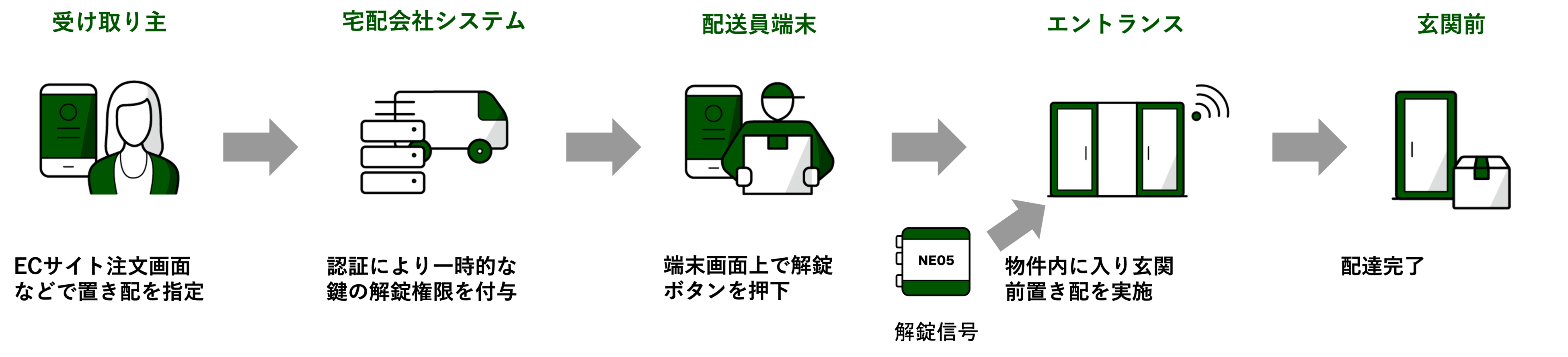 ライナフの「NinjaEntrance」とヤマト運輸の「マルチデジタルキープラットフォーム」がAPIでシステム連携し、入居者様のエントランスオートロック解除の承諾を得ていることが前提で、配送スタッフ専用のWebアプリケーションから、オートロックの解錠を可能にします。また、暗号化通信を用いることで、配送スタッフはセキュアな入館が可能になります。入居者様は、ヤマト運輸よりE-メールやLINEなどから通知される荷物のお届け予定に記載されているリンクから、受取り日時・場所を変更するページにアクセスして「置き配」(※1)をする場所(※2)を選択し、エントランスのオートロック解錠の承諾(※3)をしておくだけで、自宅の玄関ドア前などで安全に荷物を受け取れるようになります。通信販売(EC)の利用者は増加しており、非対面型の置き配を望む入居者の需要は高い状態にあります。本連携を通じて、配送の効率化、ならびに個人のライフスタイルに沿った受け取りニーズの多様化に応えていきます。