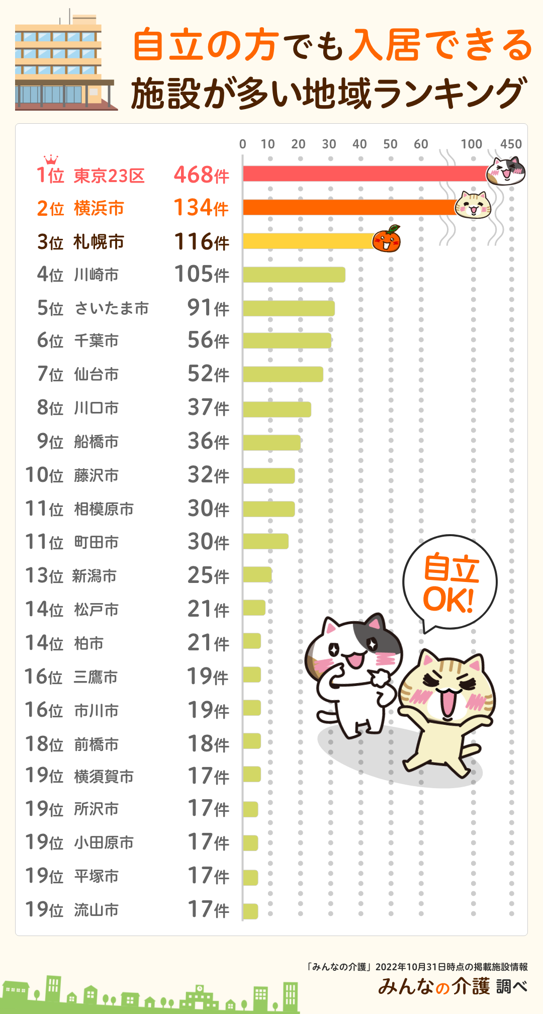 1位の東京23区を詳しく見ると世田谷区が77件で最多。上位は、練馬区(48件)・大田区(46件)・杉並区(45件)など住宅街に「自立可」の老人ホームが多い傾向が見られました。