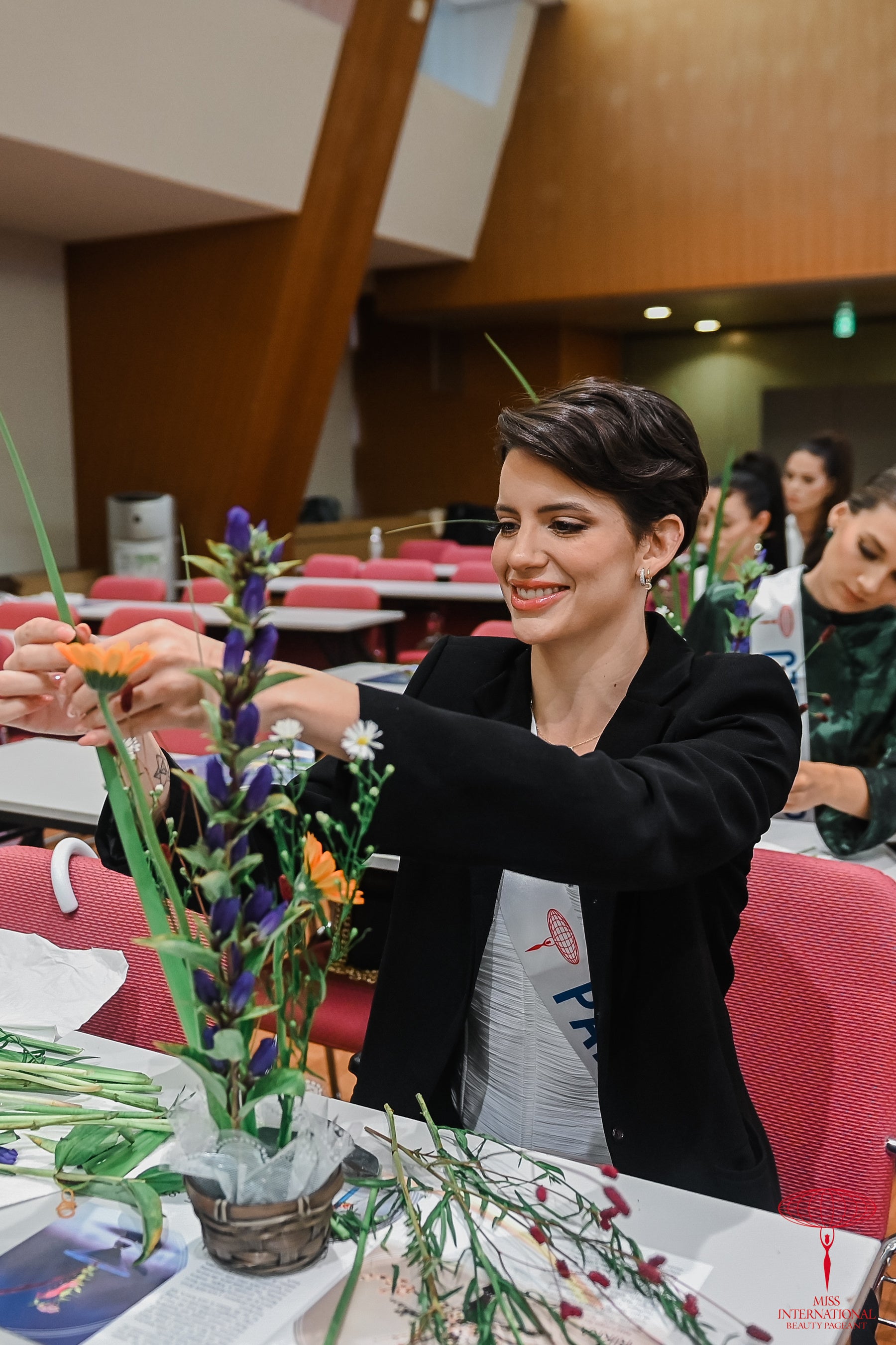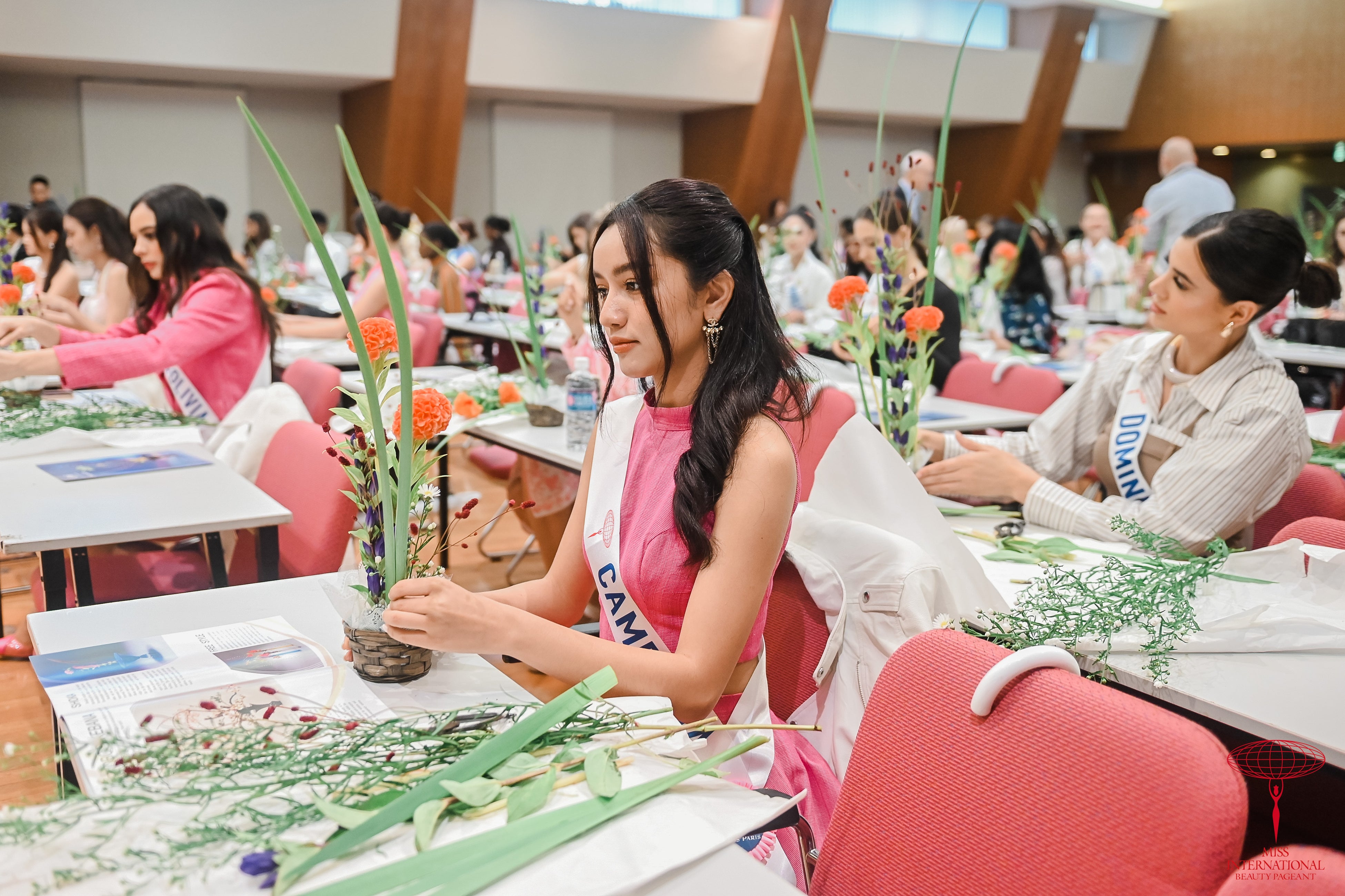 2023年10月15日(日)に2023ミス・インターナショナル世界大会出場者約70名はいけばなの根源 華道家元池坊にていけばな体験を行いました。思い思いに自由に花をいけるスタイルの自由花を体験し、花をいけました。その後ひとりずつ指導を受け、さらにいけばなの造形を深めるなど、日本文化に触れる時間となりました。