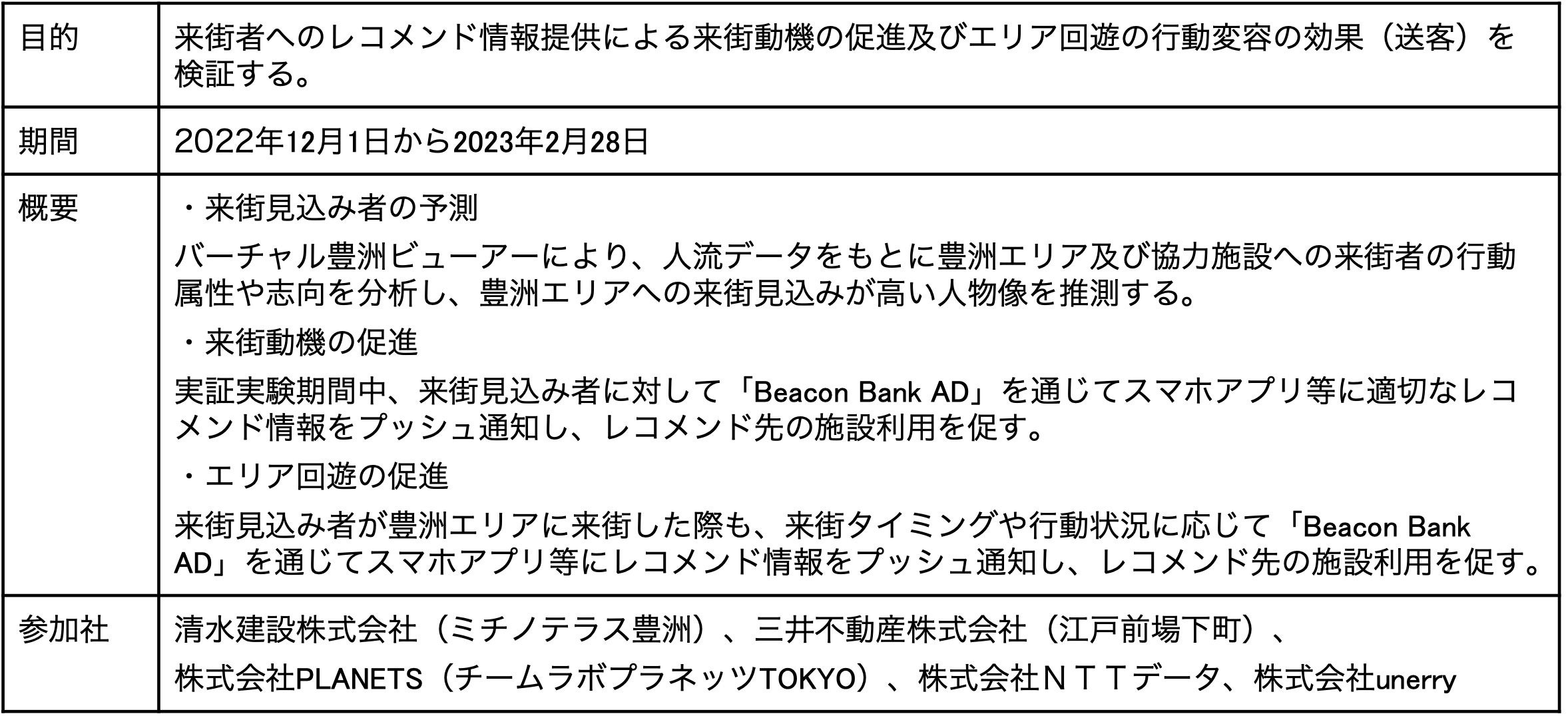 実証実験では、NTTデータが提供する豊洲エリアの都市活動から得られるデータの可視化・分析を行う「バーチャル豊洲ビューアー」の構成機能である「BizXaaS MaP® 人流分析」(ビズエクサースマップ 人流分析)により豊洲来街者の行動属性・志向を分析します。