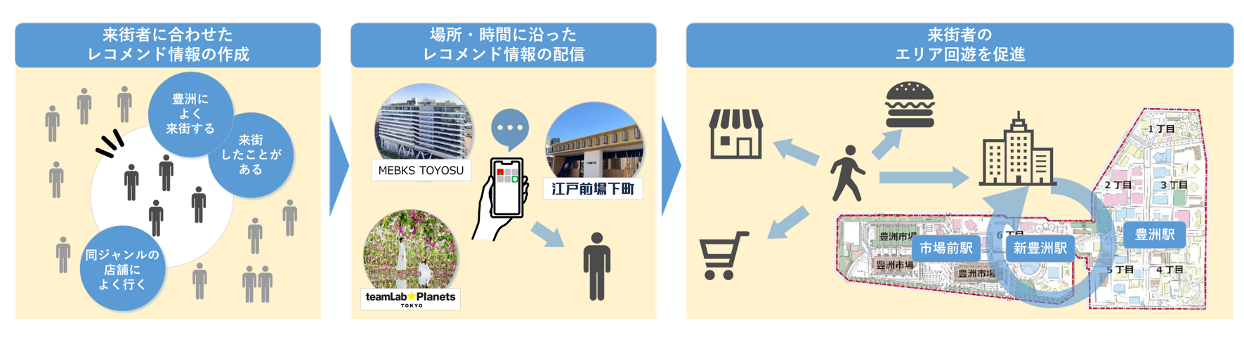 さらに得られたデータをもとに、場所・時間に沿ったレコメンド情報をunerryの「Beacon Bank AD」を使いプッシュ配信。豊洲来街者に対して好みに合った情報を届け、来街者数の増加や快適なエリア回遊などの実現を目指します。