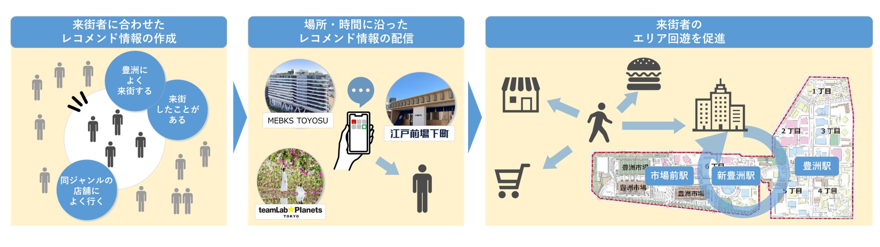 本実証実験は、来街者の行動属性や志向などを分析し、その来街者の行動(場所や時間)に応じたレコメンド情報をリアルタイムに配信することにより行動変容を促し、来街動機の促進や回遊性向上に効果をもたらすかの確認を目的に実施します。