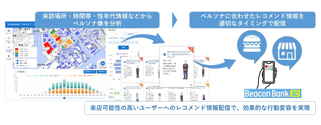 「Beacon Bank」のデータを連携した「BizXaaS MaP 人流分析」では、建物ごとの来館者の人数推計、性年代情報の推計及び行動DNA(※)を分析することで、ペルソナ像を構築することが可能です。