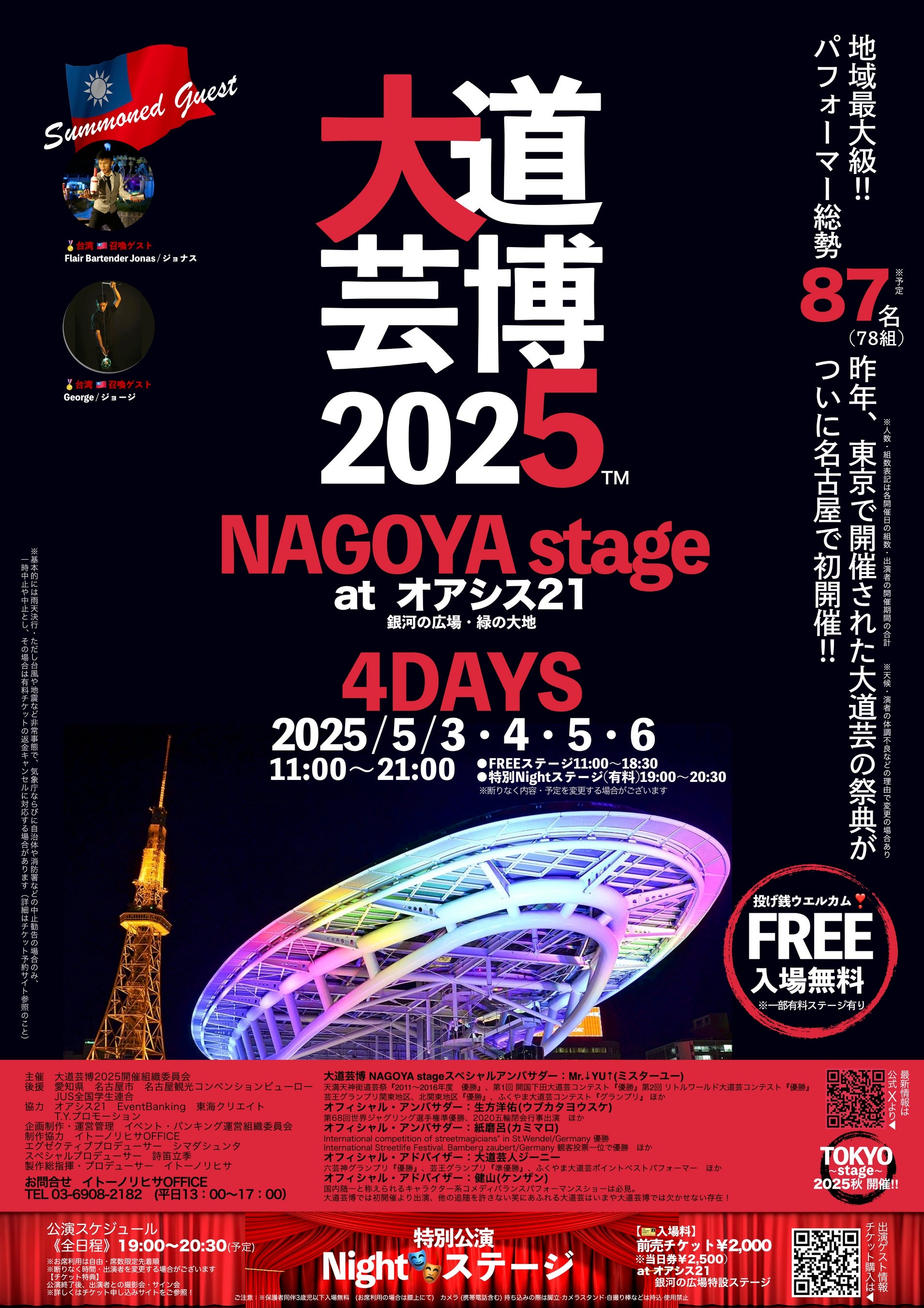 昨年、東京・中野(5月・9月アンコール公演)で開催された、大好評の大道芸イベント「大道芸博2024〜TOKYO stage〜」が数多のご要望に応え、2025年5月3日〜6日のGWの4連休、愛知県・名古屋市 オアシス21にて『 大道芸博2025 〜NAGOYA stage〜 』と題し公演の開催を決定した。