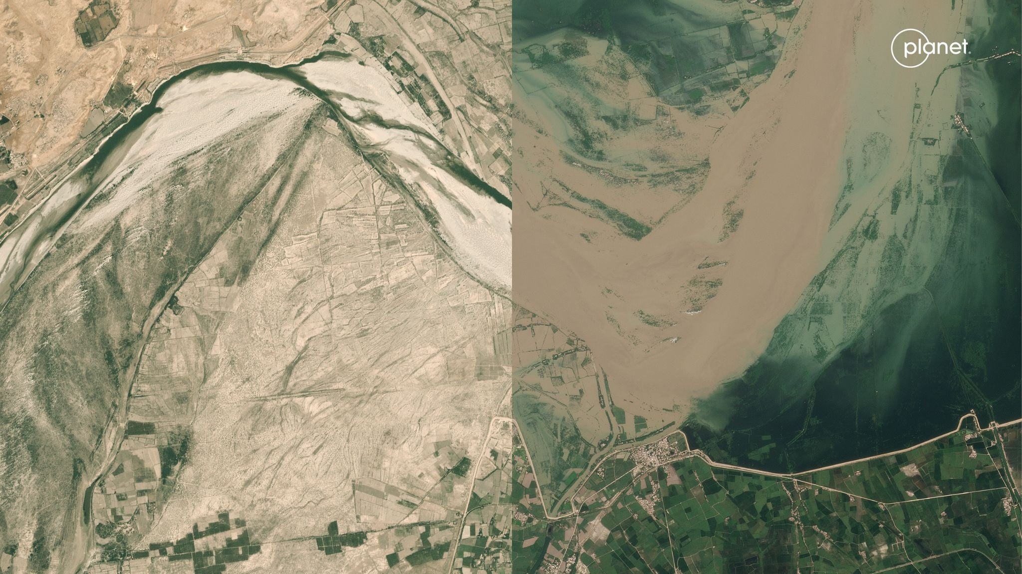 ↑パキスタン・シンド州を流れるインダス川の2018年の干ばつ時(左)と2022年の洪水時(右)の衛星写真