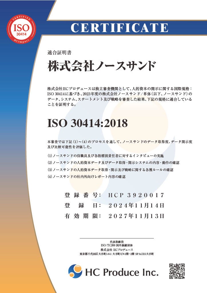 ノースサンド、人的資本に関する情報開示の国際標準ガイドライン「ISO 30414」の認証を取得