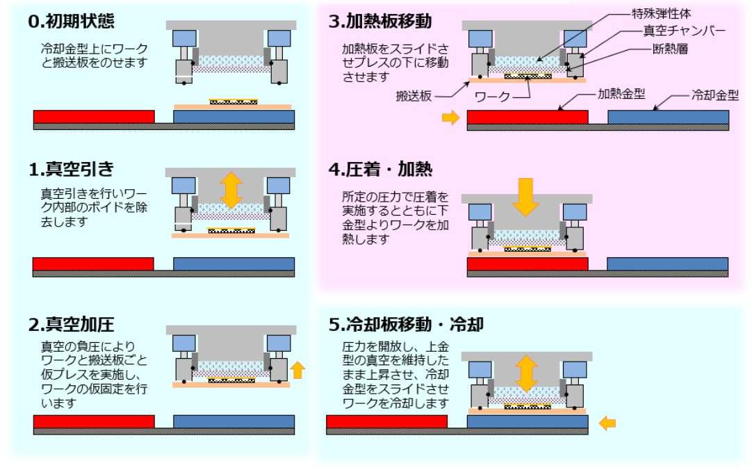 EVやIoT関連の技術発展に伴って、大電圧・大電流の電気を取り扱えるパワー半導体の需要が急速に伸びています。これらの製造に必要なプレス装置には、①均等圧・凸凹追従性能、②高温対応、③急昇温・冷却性能といった性能が望まれていますが、メタルプレス方式をはじめとする従来の技術を採用した既存製品では、これをすべて満たすことはできていませんでした。