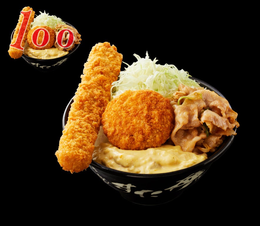 『すたみな必勝丼<白星>』は、茶わん約三杯分もの大盛りご飯の上に千切りキャベツ、1を表す「棒ヒレカツ」、「牛カツ」、「すたみな焼き」を0に見立て、仕上げに「タルタルソース」で白を演出しております。総重量約700gの重量でお腹を満たすとともに、“100”点を目指していただく丼ぶりに仕上げております。