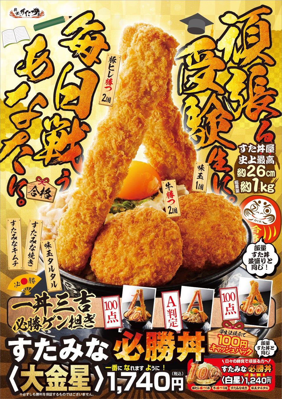 正月休みも終わり、学生は大学入学共通テストを皮切りに本格的な受験シーズンに突入します。伝説のすた丼屋は『若い方に安くて旨いものを腹いっぱい食べて頑張ってほしい』という創業者の想いから生まれた“大盛り肉丼界のパイオニア”として、受験勉強で日々頑張る学生を食を通じて応援したい!との想いから、総重量約1kgの大ボリュームの『すたみな必勝丼<大金星>』を販売することといたしました。
