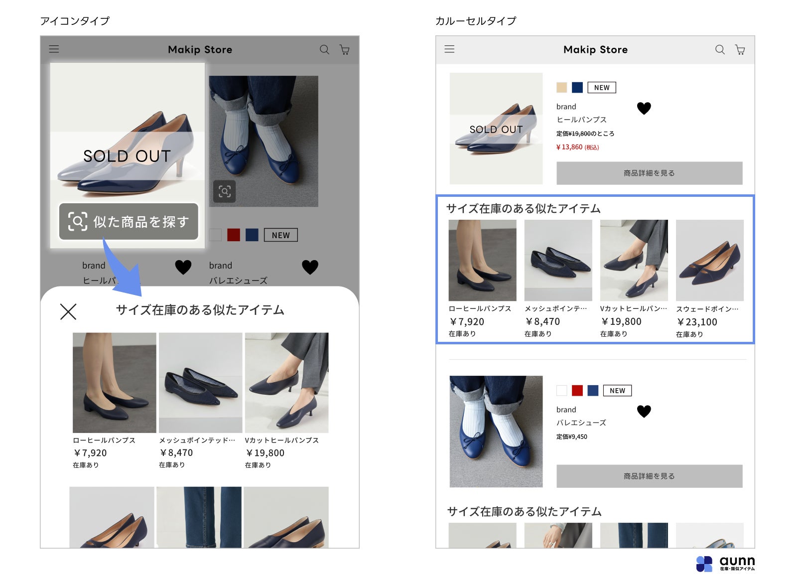 シューズカテゴリーは、サイズや素材・色味によるバリエーションの多さから、欠品が発生しやすいカテゴリーのひとつです。サイズ・カラーの一部が売り切れてしまうと、商品ページからの離脱や検索のやり直しにつながりやすく、機会損失が生まれやすい傾向があります。こうした背景を受け、従来、洋服やバッグを適用対象としていた「aunn 在庫・類似アイテム」のサービス範囲を拡大し、新たにシューズカテゴリーを対象範囲といたしました。