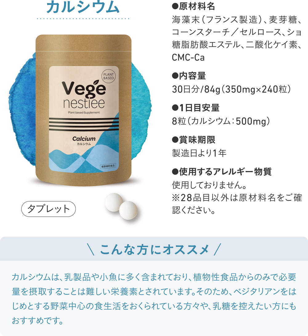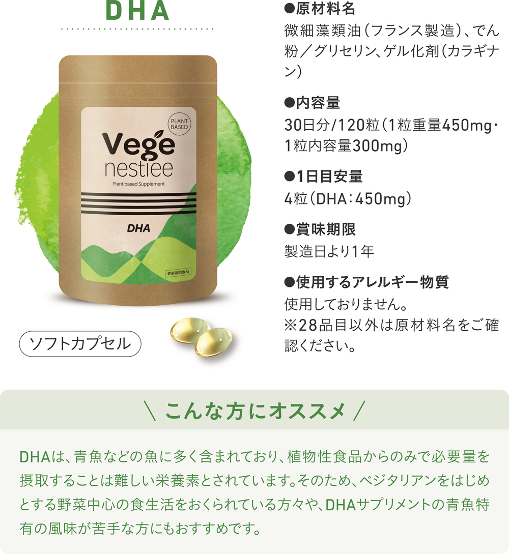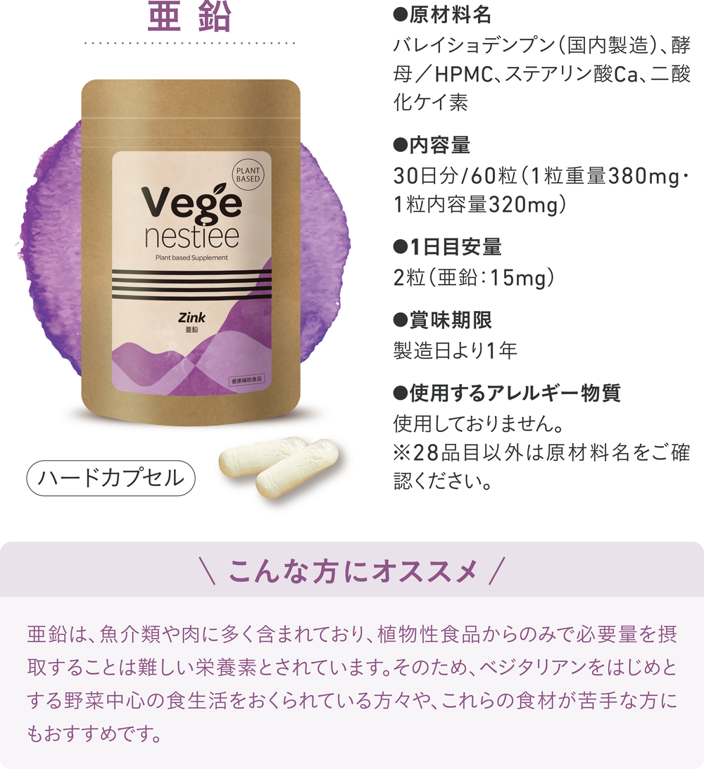 内容物からカプセルに至るまで、「肉」、「魚」、「乳製品」、「はちみつ」等を含む動物由来の原材料を配合せずに作り上げた、プラントベースサプリメントです。そのため、動物由来のものをなるべく控えたいと願う方々にも、お召し上がりいただける設計となっています。