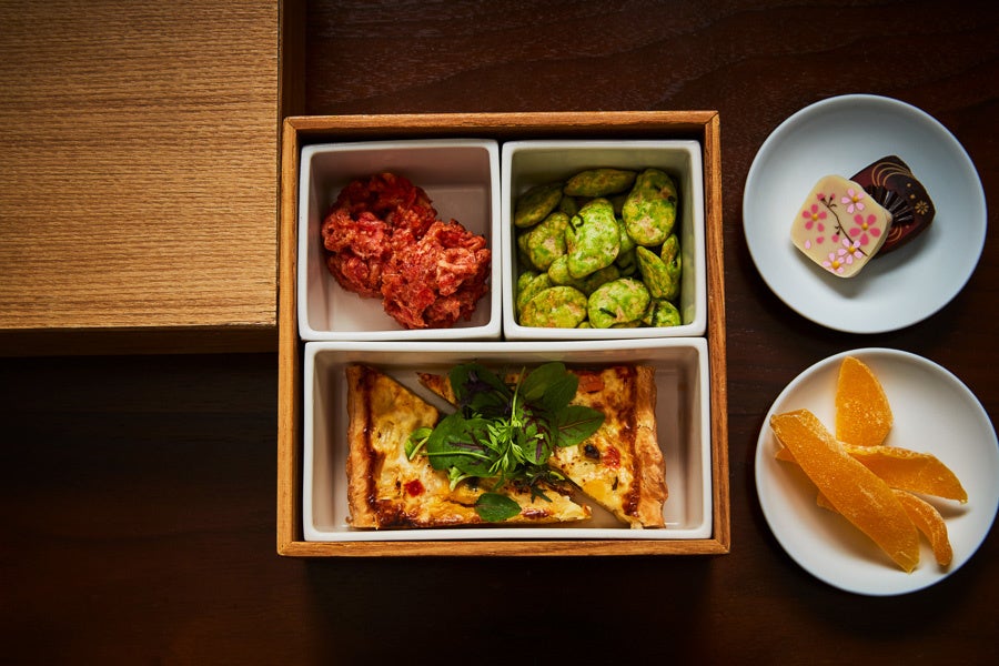 ・季節野菜のキッシュ、そら豆スナック、桜エビのかき揚げ、和柄ボンボンショコラ、ドライマンゴー