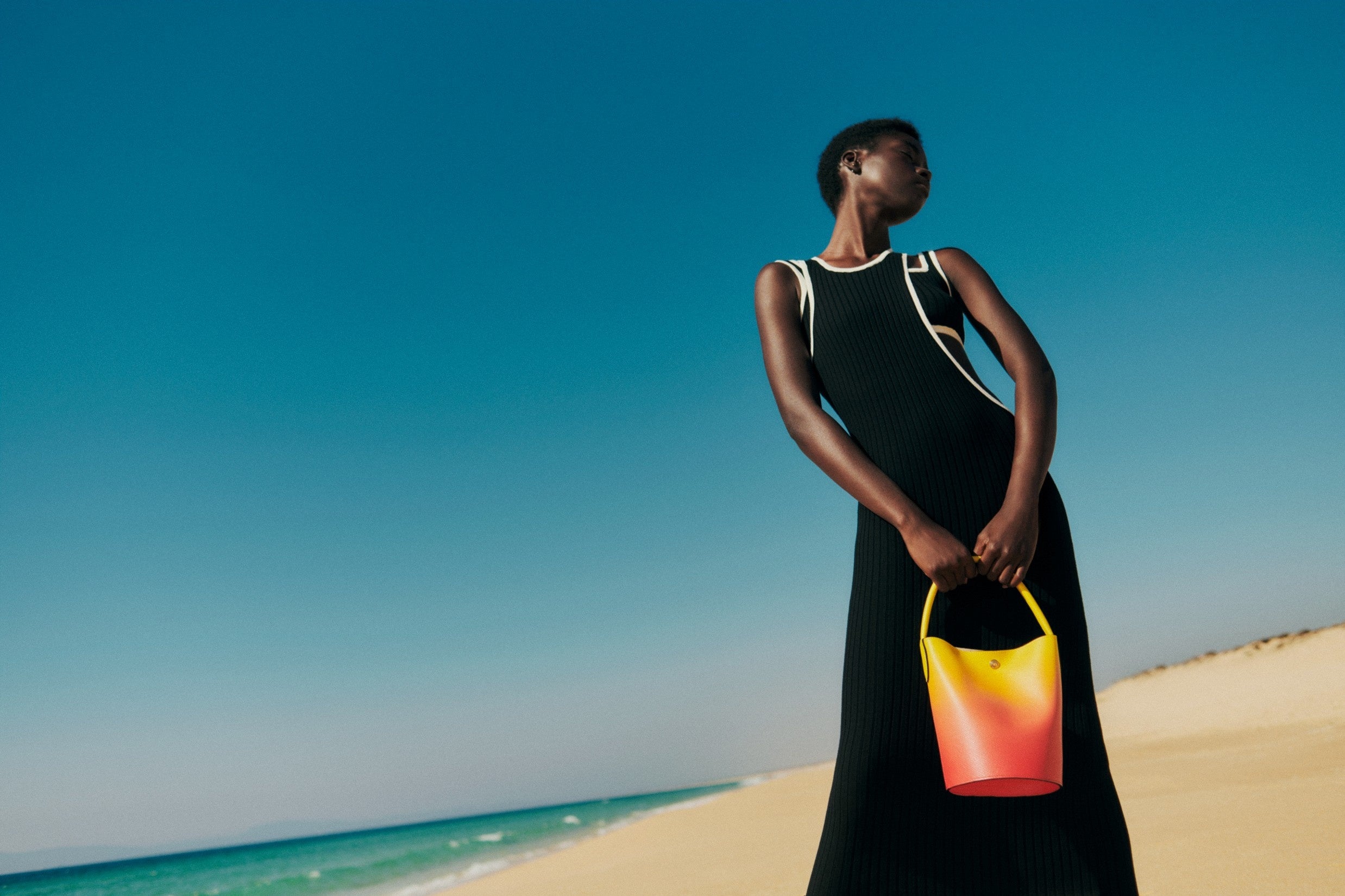 散策の途中で歩道横のカフェにふらり立ち寄った正午 – サングラス越しに街の喧騒を眺めていたロンシャンウーマンは、スパークリングウォーターでのどの渇きを潤してから滞在先に戻ります。今度はクローゼットからマルチカラーが美しい光沢を放つオーバーサイズのポロカラーストライプチュニックを選び、光線をイメージした柄のストールをヘッドバンド風に巻き、履き心地の良いフラットサンダルに履き替え、サンセットをイメージしたタイダイの「ル プリアージュ® フィレ」や太陽のようなスピリットを帯びたストライプの「エッセンシャル トワル」でスタイルを完成させます。太陽が燦燦と降り注ぐビーチは、踏みしめる砂が温かく、海の青さが空と溶け合い、友人たちの笑い声が響き渡ります。ロンシャンウーマンのスポーティでセンシュアルな魅力を引き立てるのは、メゾン初となるスイムスーツです。アシンメトリ-なストラップが付いたユニークなスイムスーツは、ボディスーツとしてパンツルックとも相性が良いアイテムです。ロンシャンウーマンはスイムスーツのカラーと絶妙にコントラストの効いた「Fatboy x Longchamp」インフレータブルアームチェアに身を委ねたり、満ち引きする波と戯れたり、友人たちとビーチテニスやバレーボール、モルックに興じます。