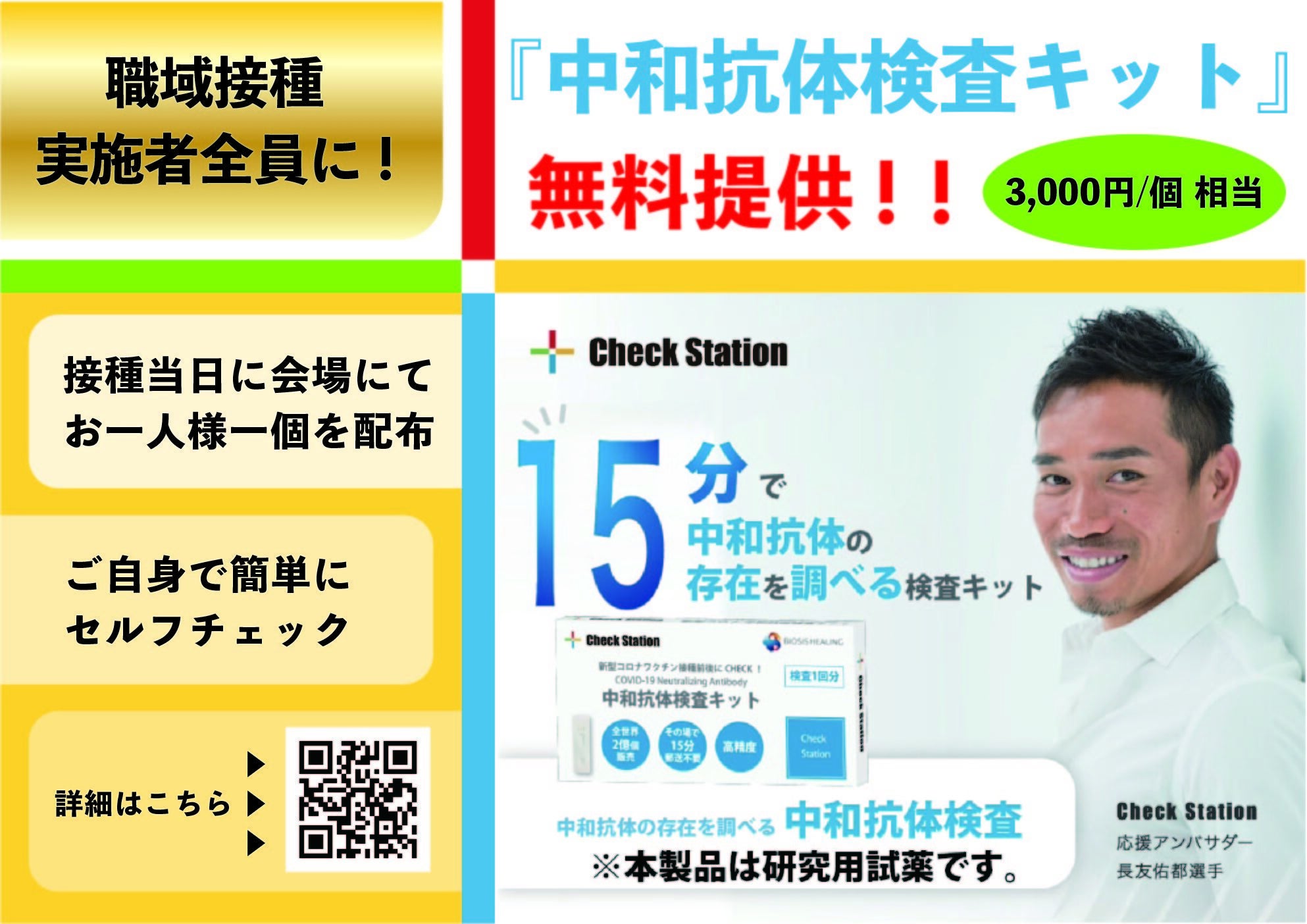 さらに今回の3回目の職域接種会場において、弊社の新型コロナ検査サービス「Check Station」で展開している①中和抗体検査(3,000円相当)を全員に無償提供し、②復興あんしんパスポート(あんパス)を希望者に無料発行いたします。