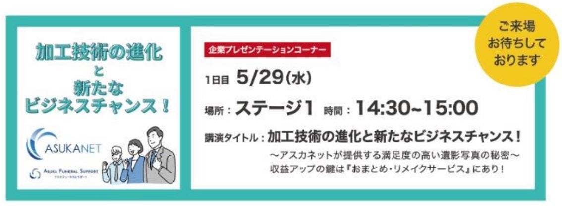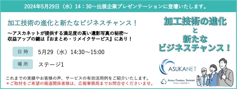 そこでアスカネットは葬儀社様の「業務効率」「差別化」「収益確保」など多様なニーズに応えるサービス・商品を多数ラインナップし、「フューネラルビジネスフェア2024」でご紹介いたします。また、展示会初日の5月29日(水)には「加工技術の進化と新たなビジネスチャンス!」と題してプレゼンテーションを実施いたします。