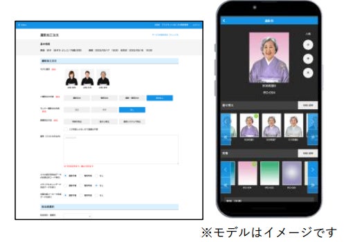 スマートフォンでの操作がしやすくなり、葬家宅からでも注文が可能となりました。これによりご遺族との打ち合わせ後、事務所に戻れば、遺影加工が完成しているという流れが作れて、業務効率化に大きく貢献します。遺影写真の着せ替えや背景をシミュレーションしながら、ご遺族とリアルタイムで共有しながら打ち合わせができるので、発注ミスなどのトラブル防止にもつながります。