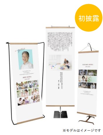 故人様の写真を複数枚組み合わせたり、個人のプロフィールなどの文章を自由に組み合わせることができる『ロングコラージュ』を新たに販売いたします。故人様との思い出を1枚の用紙にまとめることで、思い出コーナーや待合室を彩り、ロール紙により長さも自由に調整することができるため、さまざまな形でご遺族や会葬者と故人の思い出を多角的に写し出すことができます。