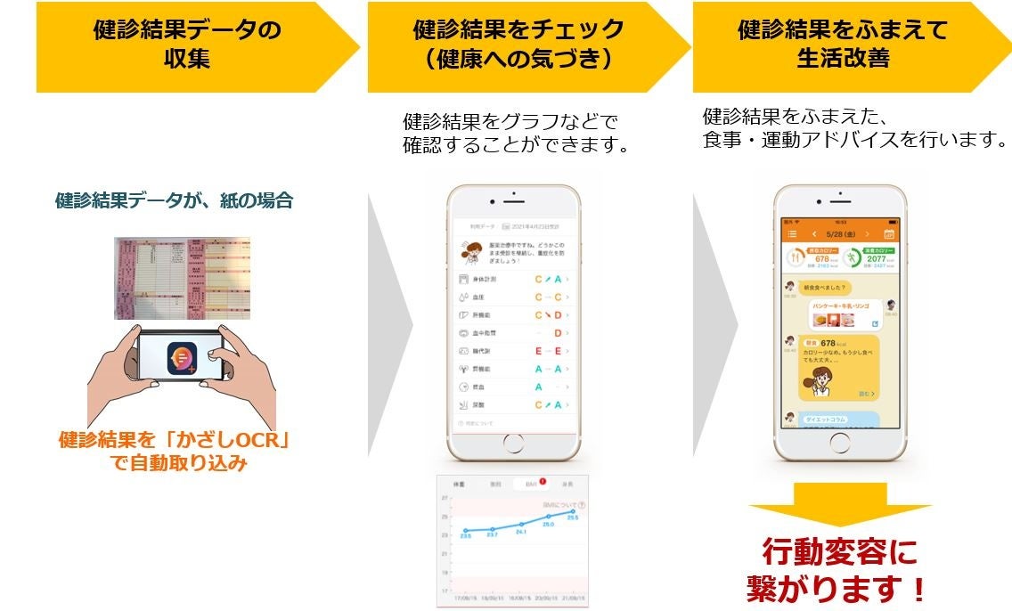 ■「カロママ プラス」の機能:健康診断結果とライフログが連携し、パーソナルなアドバイスを提供