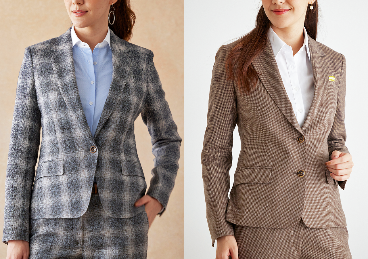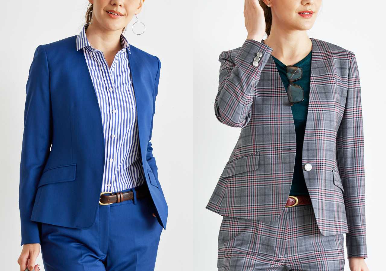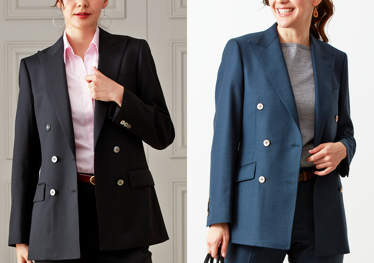 テーラードジャケット(1つボタン/2つボタン)、ノーカラージャケット(ボタン/ホック)の4種類をご用意。
