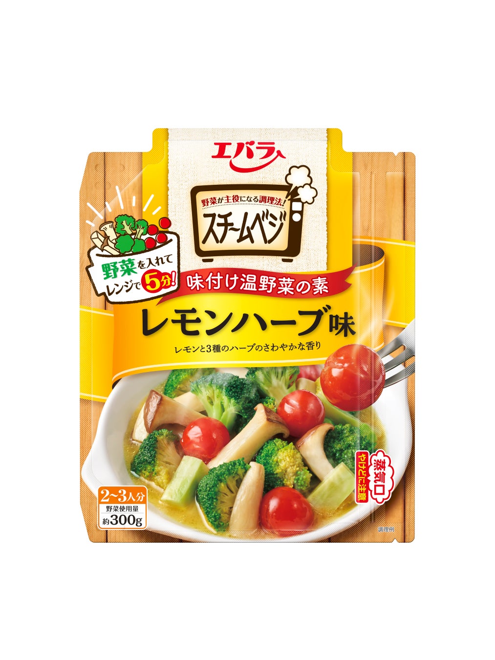 ラインアップはレモンやハーブが香る洋風な味わいの「レモンハーブ味」、魚介の風味にガーリックを効かせた「魚介ガーリック味」の2品。パッケージ記載のブロッコリー、エリンギ、ミニトマトといったメニュー以外にも、ニンジンやダイコン、ナス、レンコンなど野菜の旬や好みに合わせてアレンジできます。「スチームベジ」の販売を通じて、野菜不足の方や野菜料理がマンネリ化している方などにお役立ていただけるよう提案してまいります。