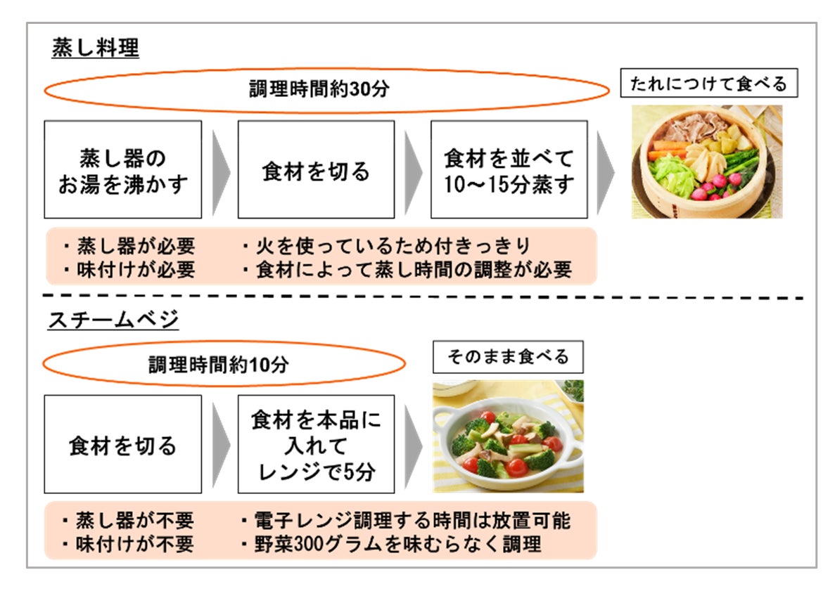 野菜不足の解消に!味付け温野菜の素「スチームベジ」新発売 レンチン5分で野菜300グラムを一度に調理