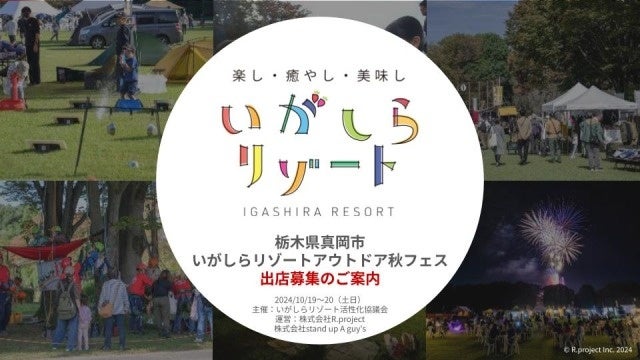 株式会社R.project(本社:千葉県安房郡鋸南町、代表取締役:丹埜倫、以下「R.project」)は、いがしらリゾート活性化協議会と共に、アウトドアや外遊びが好きなご家族を対象としたイベント「いがしらリゾート アウトドア秋フェス」を、栃木県真岡市のいがしらリゾートにて、2024年10月19日(土)と20日(日)に開催いたします。。イベント開催にあたって、アウトドアに関心を持つファミリー層や若年層をターゲットに、多彩なアウトドア体験や食のコンテンツを提供し、いがしらリゾートの魅力を発信していただける出店者をご募集いたします。昨年は、単日開催、雨天のなか、約5000人にご来場いただきましたが、今年は、来場人数10,000名を目標に、さらに充実したイベント内容を準備しています。