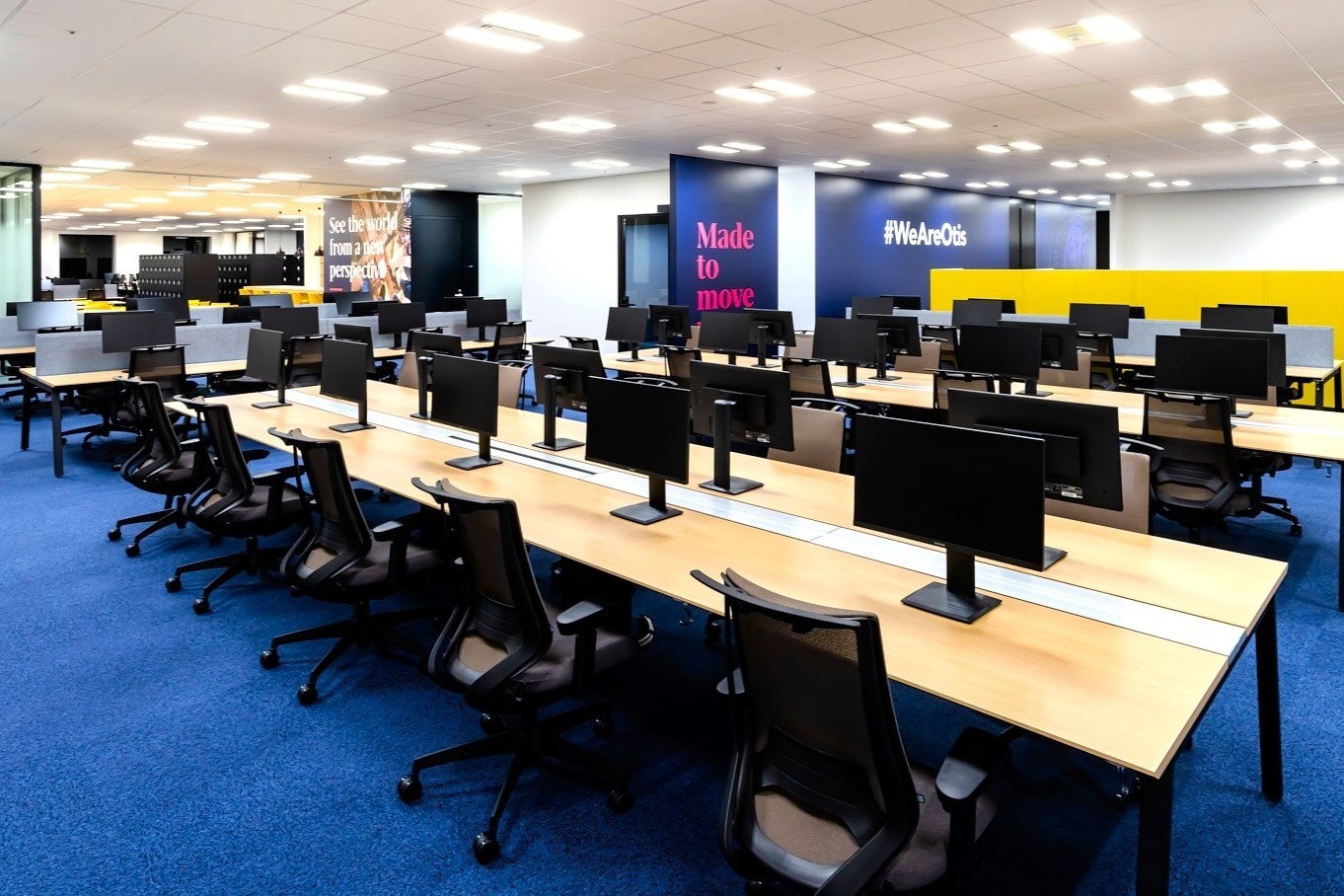 オーチスのグローバルなデザインとブランドイメージを用いた新しいオフィスでは、業務プロセスのデジタル化とペーパーレス化により、オフィスワークとリモートワークの両方を活用したハイブリッドな働き方を推進する職場環境の構築を実現しました。