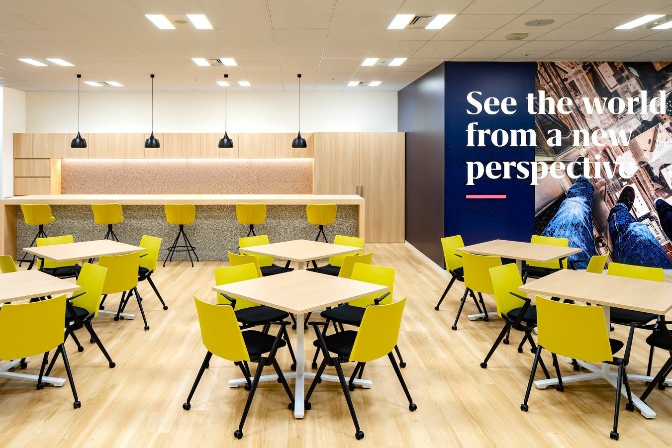 また社員が固定席を持たずに好きな席で働くことができるフリーアドレス・システムや、他の拠点の社員も自由にオフィスを活用できるサテライト・オフィス・システムを導入しました。またカフェエリアを設置することで、社員の生産性と創造性を高める環境も整えました。旧オフィスと比較してオフィスの面積を35%削減し、温室効果ガス (GHG) の排出量も抑制しました。