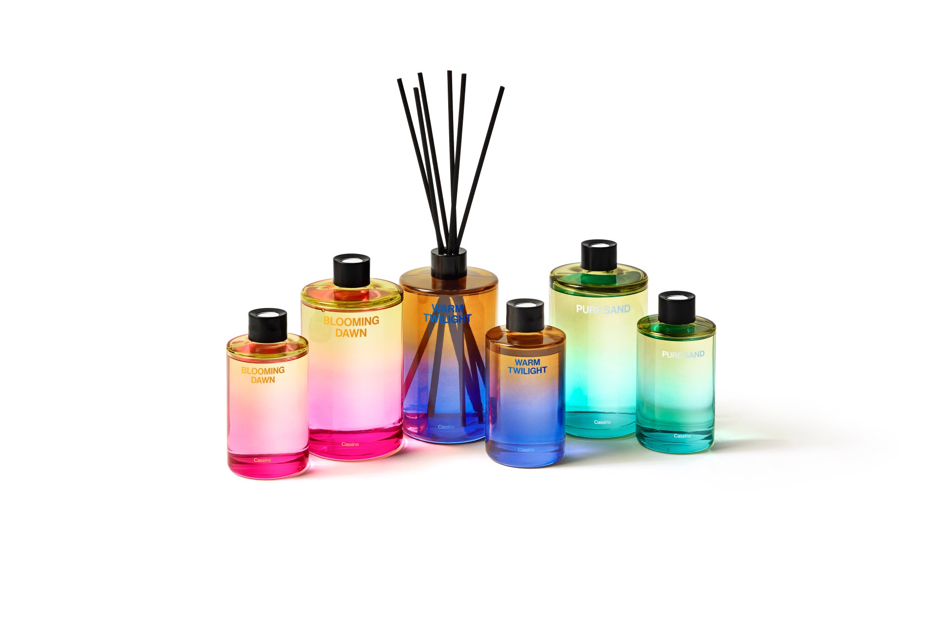 デザインと香りが融合したCassina Home Fragrancesシリーズは、3つの新しい香りをラインアップに加えました。キャンドルとディフューザーの展開で、香りは二色のグラデーションが美しいガラス容器に詰められています。機能的にペアリングされ、これらの香りは互いにブレンドするようにデザインされており、同じ空間の中で調和のとれた嗅覚体験を提供します。