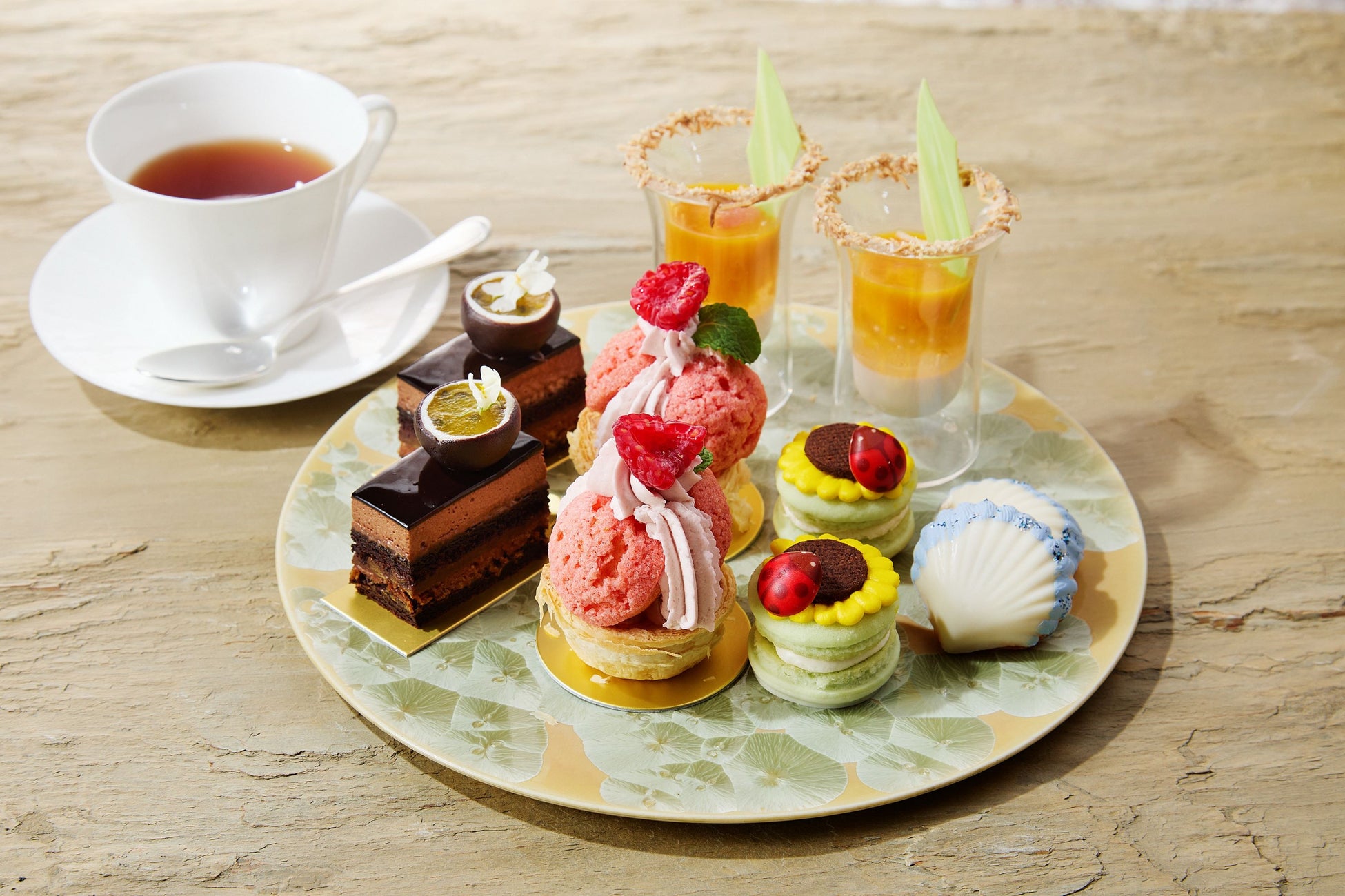 スイーツには、ココナッツミルクプリン、ココナッツウォーターゼリーとマンゴークーリ(ソース)が、鮮やかなグラデーションで魅せるグラスに入った香港発祥の「楊枝甘露(ヨウジーガムロ)」。甘い果肉をしっかり感じられる角切りのマンゴーと、タピオカの弾力を楽しみながら、ピンクグレープフルーツの酸味でさっぱりお召し上がりいただけます。エッグタルトの上に桃とライチを乗せ、ピーチクリームとクッキーシューで仕上げた「桃とライチのサントノーレ」は、フルーツの甘酸っぱい香りと、濃厚でクリーミーなエッグフィリングのコンビネーションをご堪能ください。貝殻の形がかわいらしい焼き菓子は、真夏に浜辺で大人の喉を潤すモヒートをイメージした「モヒートマドレーヌ」。レモンカードを中心に忍ばせて、モヒートシロップをしみ込ませたマドレーヌをホワイトチョコレートでコーティングしてあります。ひまわりを模した「パイナップルパンダンマカロン」には、チョコレートのテントウムシも我慢できずにやってきました。シンガポールの朝食で人気のカヤジャムにマスカルポーネチーズを合わせた濃厚なクリームとパイナップルを、パンダンリーフでほんのり色づいたマカロンで挟みました。光沢感のある黒が印象的な「パッションフルーツチョコレートケーキ」は、南国のフルーツ、パッションフルーツとプーアル茶のクリームで、爽やかで軽い口当たりの夏仕様のチョコレートケーキです。
