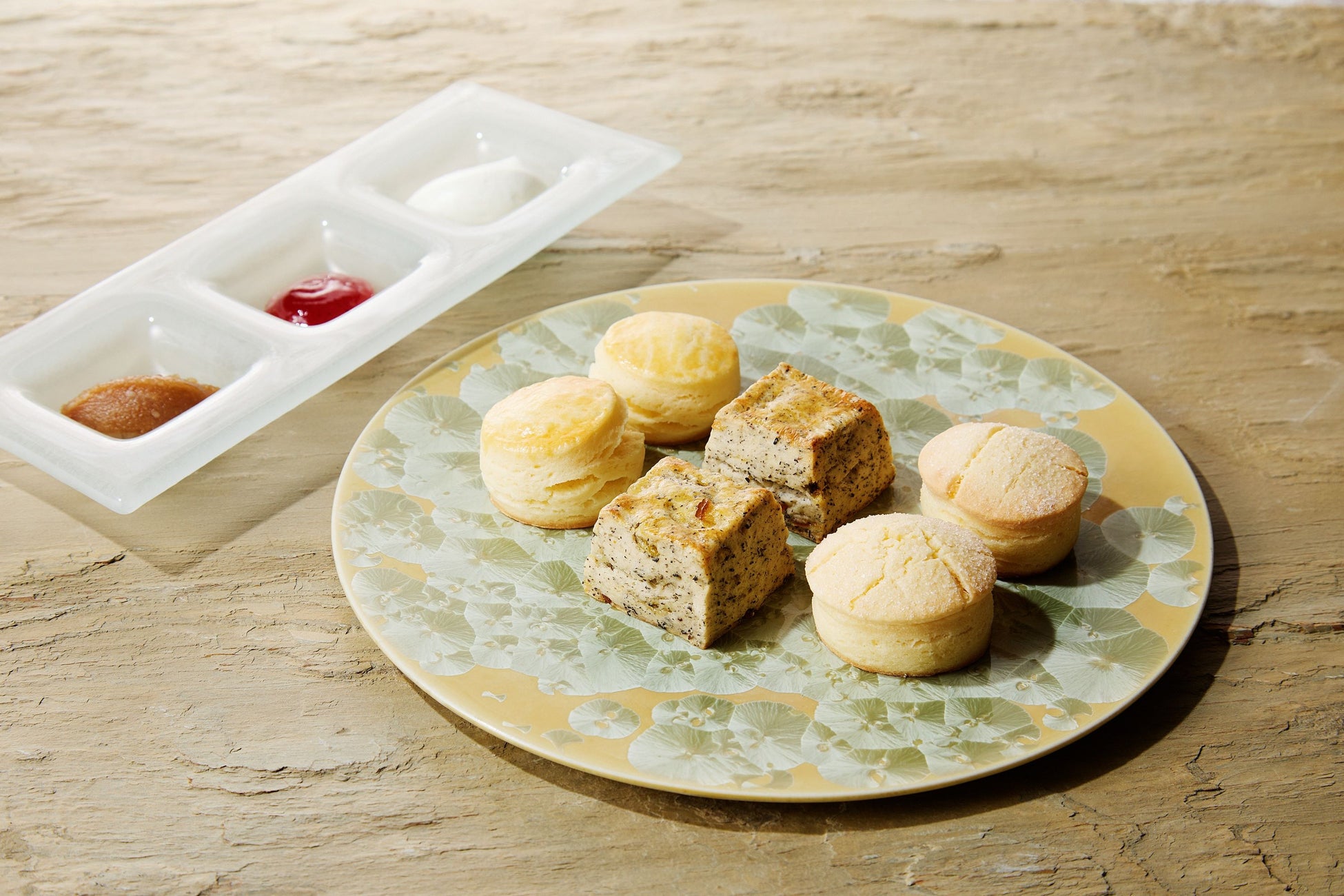スコーンは、定番のクラシック、烏龍茶とオレンジを練りこんだ新作に、クッキー生地に覆われザクザク歯ごたえのある菠蘿包(ポーローパオ)の3種類。コンディメントのクロテッドクリーム、ストロベリージャム、カヤジャムの中からお好みの組み合わせを見つけてみてはいかがでしょうか。